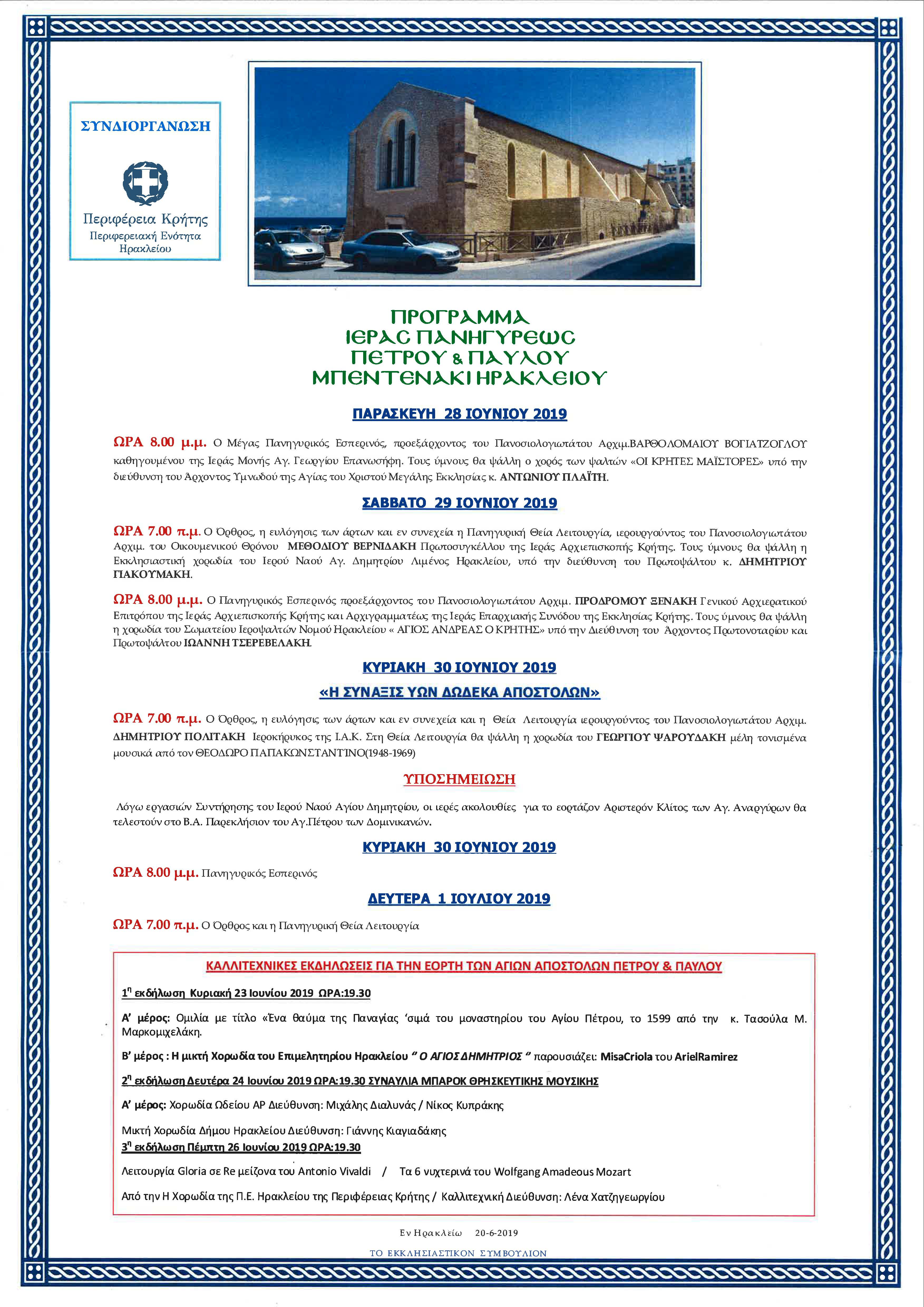Στο πλαίσιο του εορτασμού προς τιμήν των πρωτοκορυφαίων Αγίων Αποστόλων Πέτρου & Παύλου και των δώδεκα θα πραγματοποιηθούν οι προβλεπόμενες κατά την τάξιν της Εκκλησίας Ιερές ακολουθίες από 23/Ιουνίου έως 1/Ιουlίου/2019.