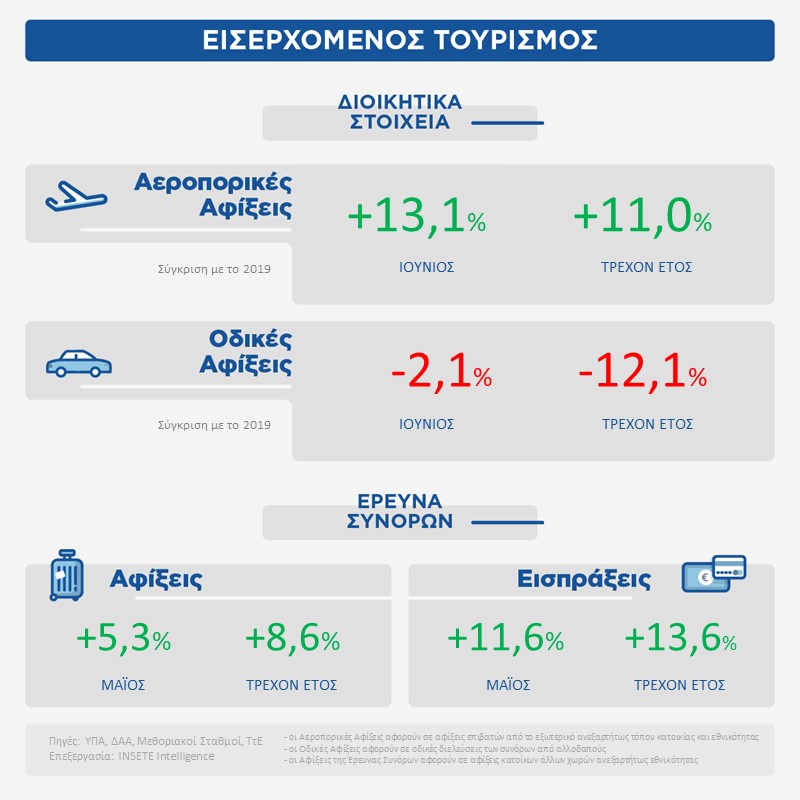 Θετικές επιδόσεις για τον ελληνικό τουρισμό, αποτυπώνουν τα στοιχεία του ΙΝΣΕΤΕ για το πρώτο 6μηνο του 2023, σε σύγκριση με πέρυσι αλλά και την χρονιά ορόσημο το 2019.