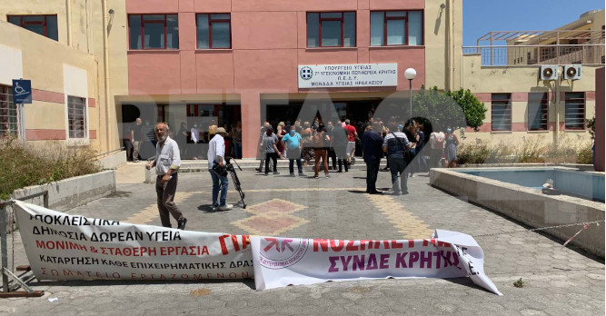 Παράσταση διαμαρτυρίας έξω από τα γραφεία της 7ης Υγειονομικής Περιφέρειας Κρήτης στο Ηράκλειο, πραγματοποιούν τα μέλη του Συλλόγου Βοηθών Νοσηλευτών Δευτεροβάθμιας Εκπαίδευσης Δημοσίου Κρήτης.