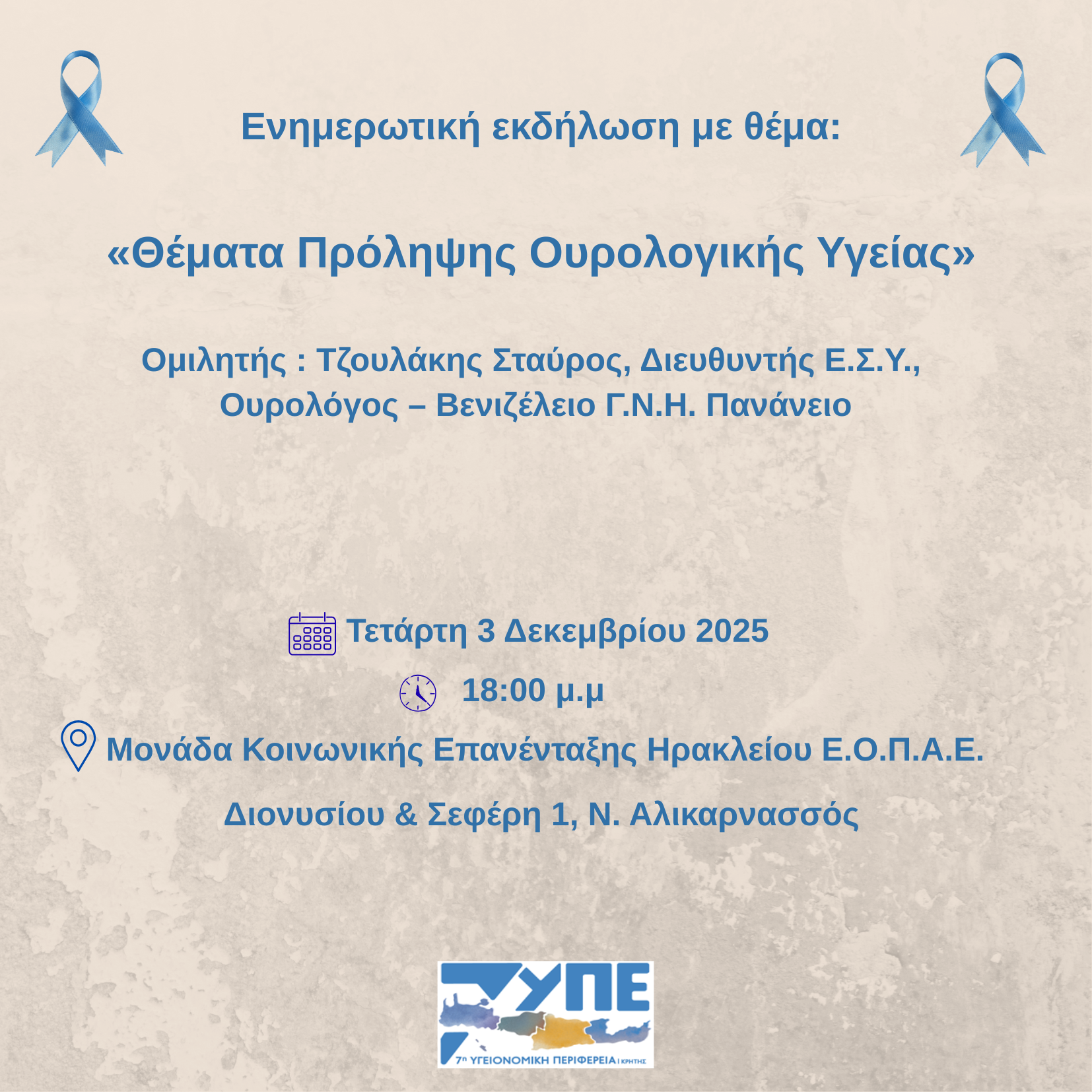 Την Τετάρτη 3 Δεκεμβρίου 2025 στις 18:00, στην Μονάδα Κοινωνικής Επανένταξης Ε.Ο.Π.Α.Ε, Διεύθυνση: Διονυσίου & Σεφέρη 1, Νέα Αλικαρνασσός, θα πραγματοποιηθεί ενημερωτική εκδήλωση σχετικά με Θέματα Πρόληψης της Ουρολογικής Υγείας για τους ωφελούμενους της Μονάδας, με ομιλητή τον Διευθυντή Ε.Σ.Υ., Ουρολόγο του ΓΝΗ Βενιζέλειο Πανάνειο, Σταύρο Τζουλάκη.
