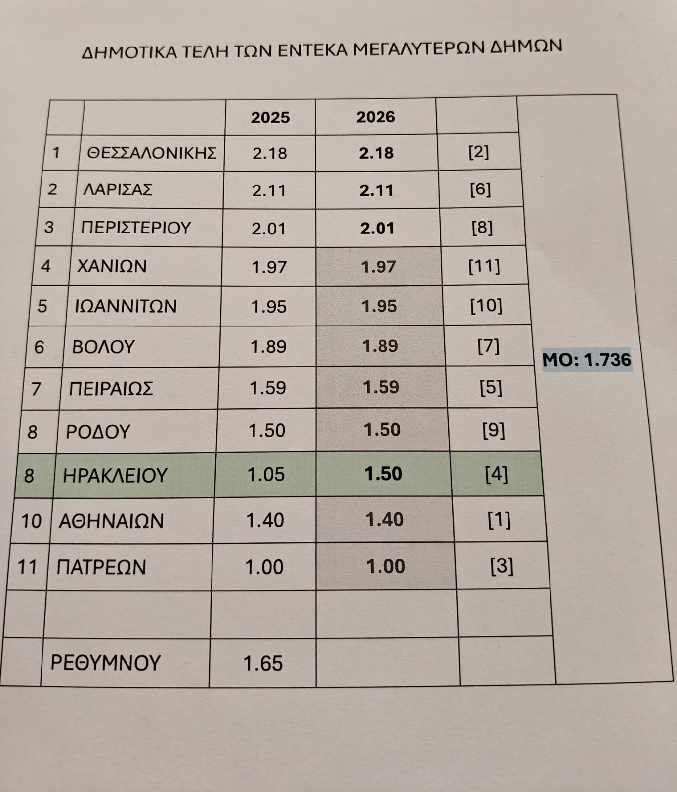 Όπως έγραψε το Creta24, η τελική τιμή για τα οικιακά τέλη ανεβαίνει στο 1,50 ανά τετραγωνικό, από το 1,05 που είναι σήμερα και αφορά σε όλο το Ηράκλειο εκτός από τα χωριά.