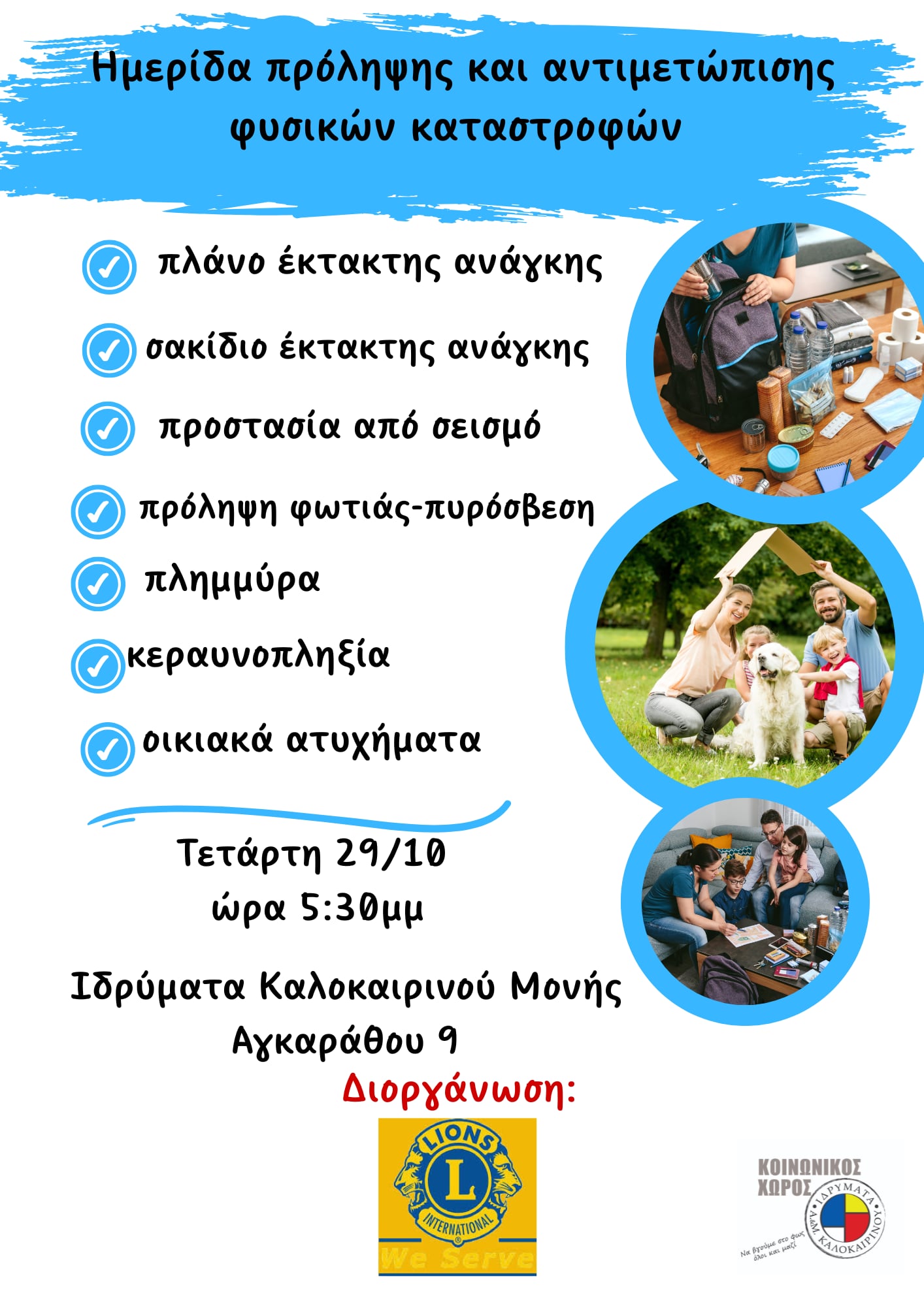 Για όλα τα παραπάνω, η Λέσχη Lions ΚΝΩΣΟΣ ανακοινώνει τη διεξαγωγή ενημερωτικής ημερίδας, ανοικτή για το κοινό, με θέμα την Πρόληψη & την Αντιμετώπιση Φυσικών Καταστροφών.