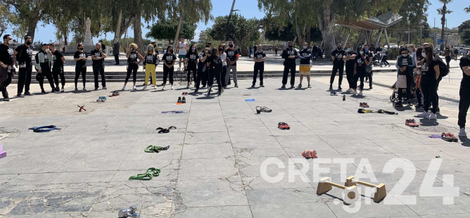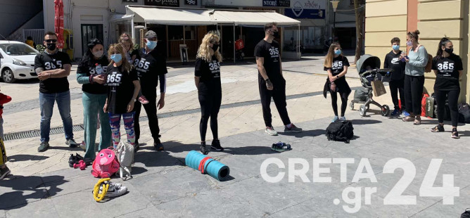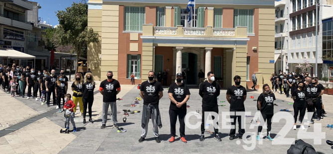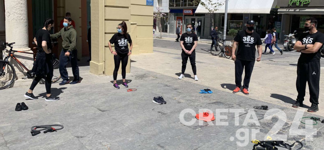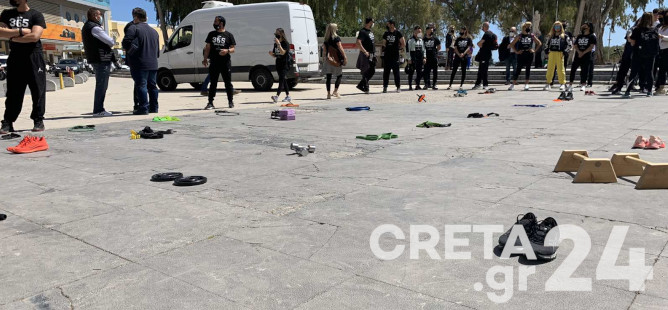 Ιδιοκτήτες γυμναστηρίων γέμισαν αθλητικά παπούτσια και εξαρτήματα γυμναστικής την πλατεία, μπροστά από το κτίριο της Περιφέρειας Κρήτης, διαμαρτυρόμενοι για το κλείσιμο των επιχειρήσεών τους για τόσο μεγάλο χρονικό διάστημα, αλλά και για τα «ανύπαρκτα», όπως ανέφεραν μέτρα στήριξης από την πολιτεία.