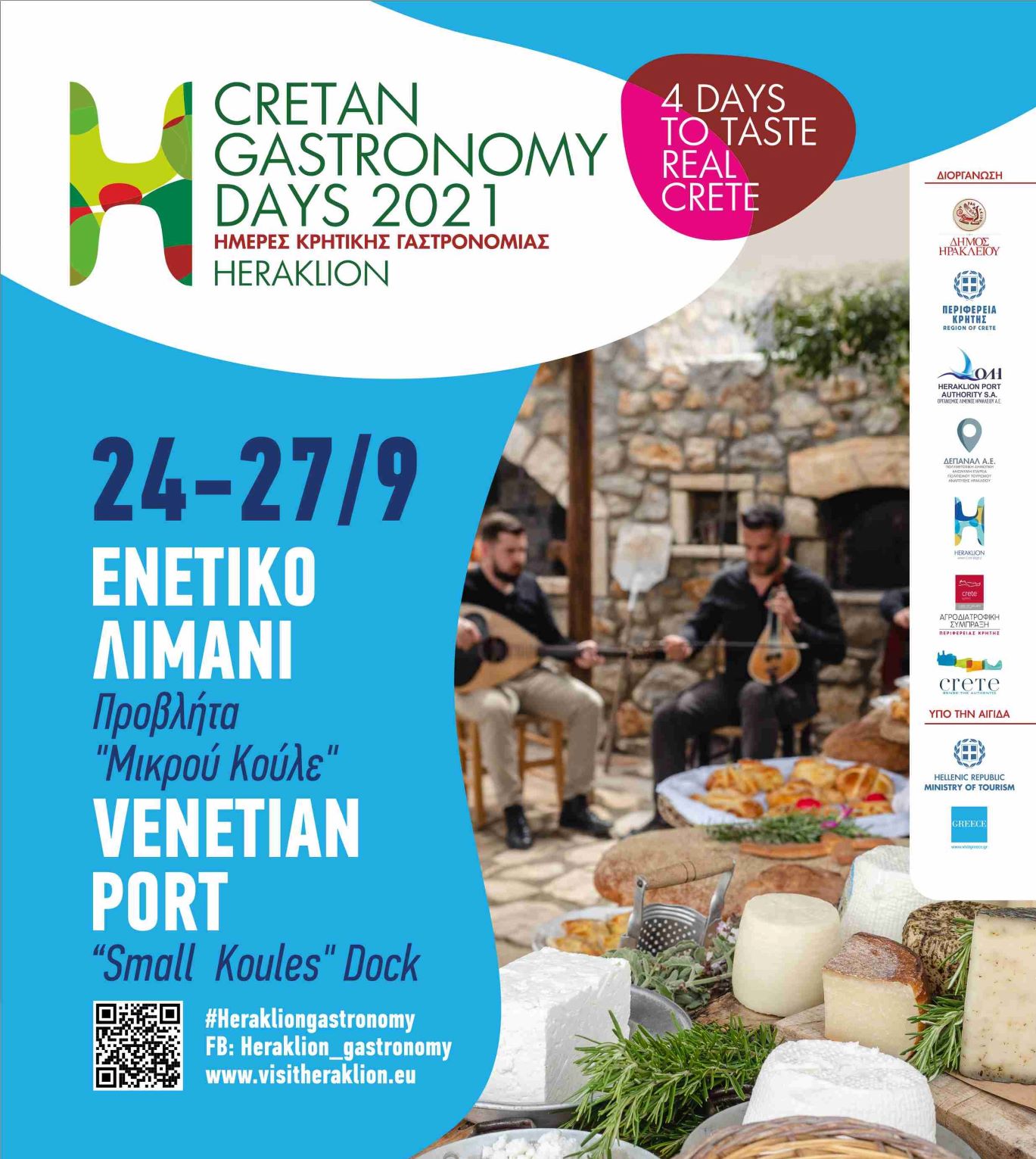Ο Δήμος Ηρακλείου οργανώνει τις εκδηλώσεις «Ηράκλειο, Μέρες Γαστρονομίας 2021/Heraklion Gastronomy Days 2021» από την Παρασκευή 24 μέχρι και την Δευτέρα 27 Σεπτεμβρίου (Παγκόσμια Ημέρα Τουρισμού). Πρόκειται για την 3η διοργάνωση από το 2018 μέχρι σήμερα, μετά από μία παύση το 2020 λόγω της πανδημίας COVID-19.