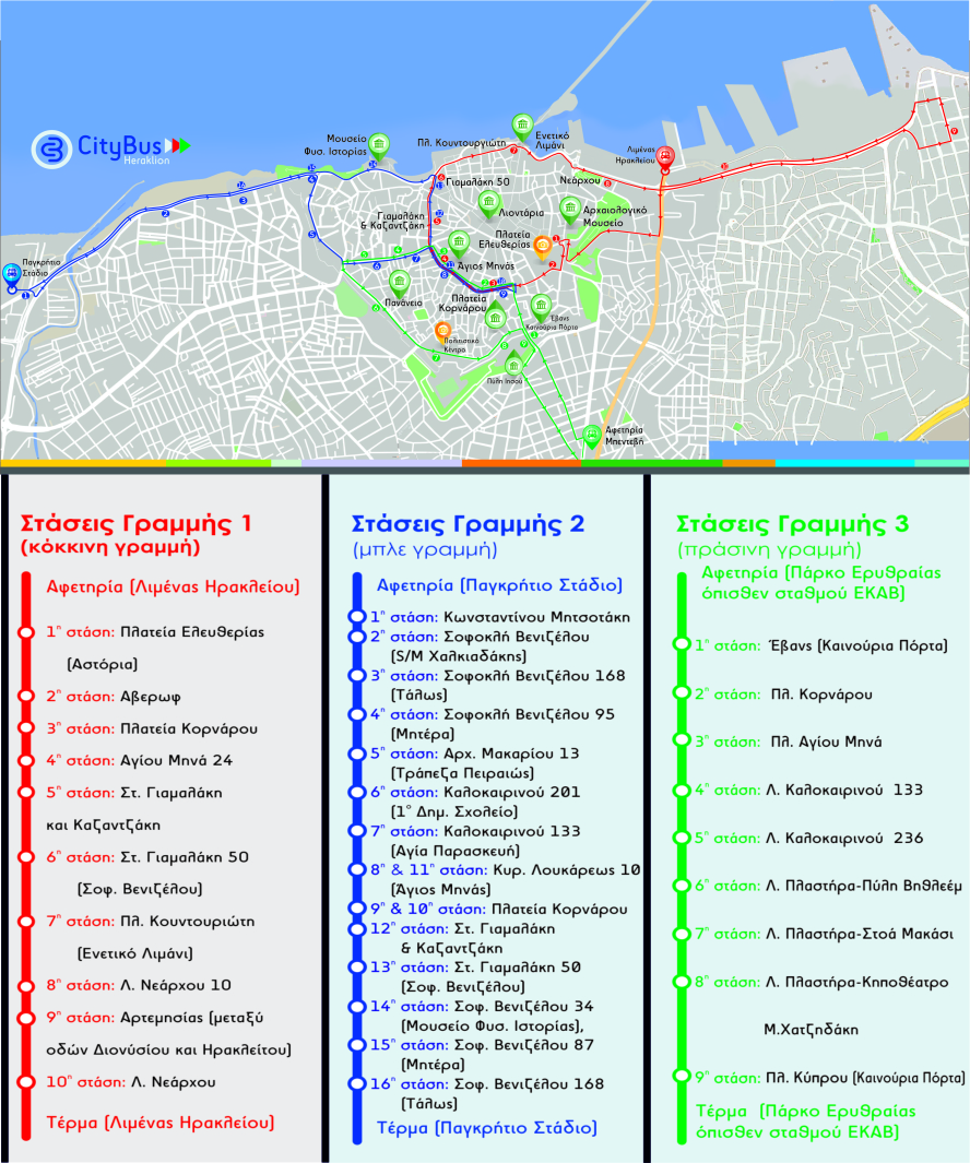 Να υπενθυμίσουμε ότι ήδη λειτουργούν δύο γραμμές Mini Bus, η κόκκινη γραμμή με αφετηρία το λιμάνι, η οποία εξυπηρετεί τους κατοίκους των ανατολικών περιοχών της πόλης και η μπλε γραμμή με αφετηρία το Παγκρήτιο Στάδιο, η οποία εξυπηρετεί τους κατοίκους των δυτικών περιοχών της πόλης.