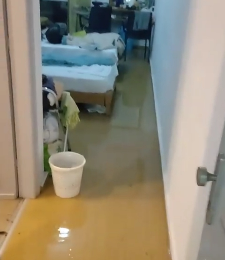 Οι φοιτητές προσπαθούν μόνοι τους να απομακρύνουν το νερό από τους διαδρόμους και τα δωμάτια με αυτοσχέδια μέσα (σφουγγαρίστρες, μπλούζες κλπ).