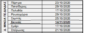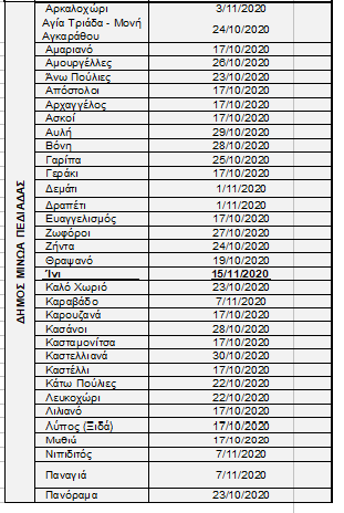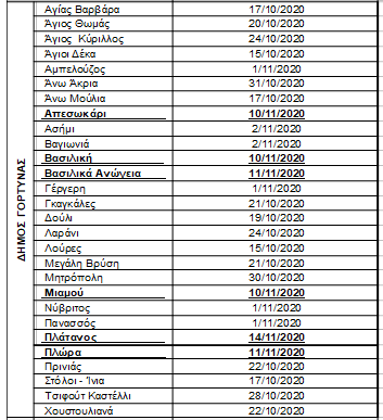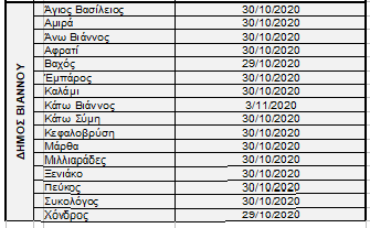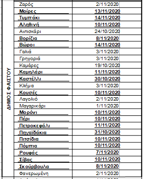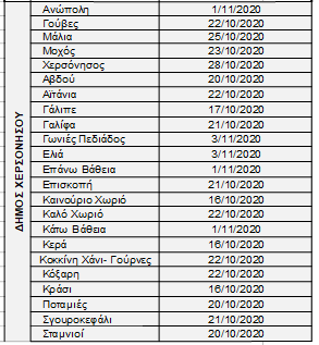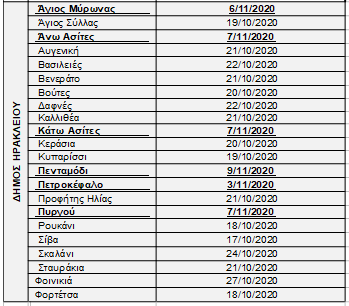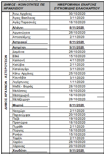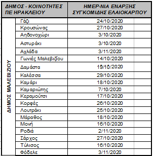 Οι ημερομηνίες έναρξης συγκομιδής του ελαιόκαρπου στις Τοπικές Κοινότητες της Περιφερειακής Ενότητας Ηρακλείου διαμορφώνονται σύμφωνα με το συνημμένο ΠΙΝΑΚΑ Ι. Διευκρινίζεται ότι στις Τοπικές Κοινότητες στις οποίες οι δολωματικοί ψεκασμοί ολοκληρώθηκαν μετά την έκδοση του Δελτίου Τύπου της 23ης Οκτωβρίου 2020, οι ημερομηνίες έναρξης συγκομιδής του ελαιόκαρπου φαίνονται υπογραμμισμένες και με έντονο μαύρο χρώμα.