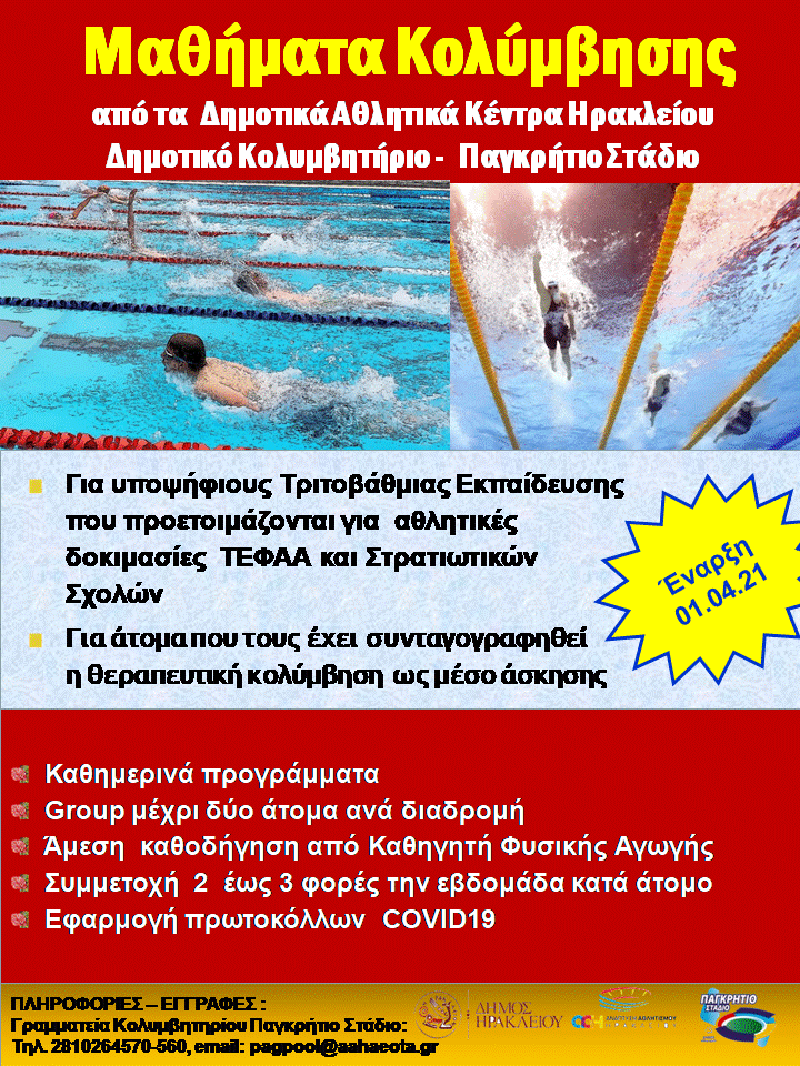 Στο πλαίσιο επαναλειτουργίας της δημοτικής πισίνας στο Παγκρήτιο Στάδιο, η Ανάπτυξη Αθλητισμού Ηρακλείου ΑΕ ΟΤΑ ανακοινώνει την έναρξη τμημάτων κολύμβησης για την προετοιμασία υποψήφιων Τριτοβάθμιας Εκπαίδευσης – ΤΕΦΑΑ καθώς επίσης και τμήματα για θεραπευτική κολύμβηση (σύμφωνα με τα ισχύοντα πρωτόκολλα για την αποφυγή διασποράς του Covid -19).