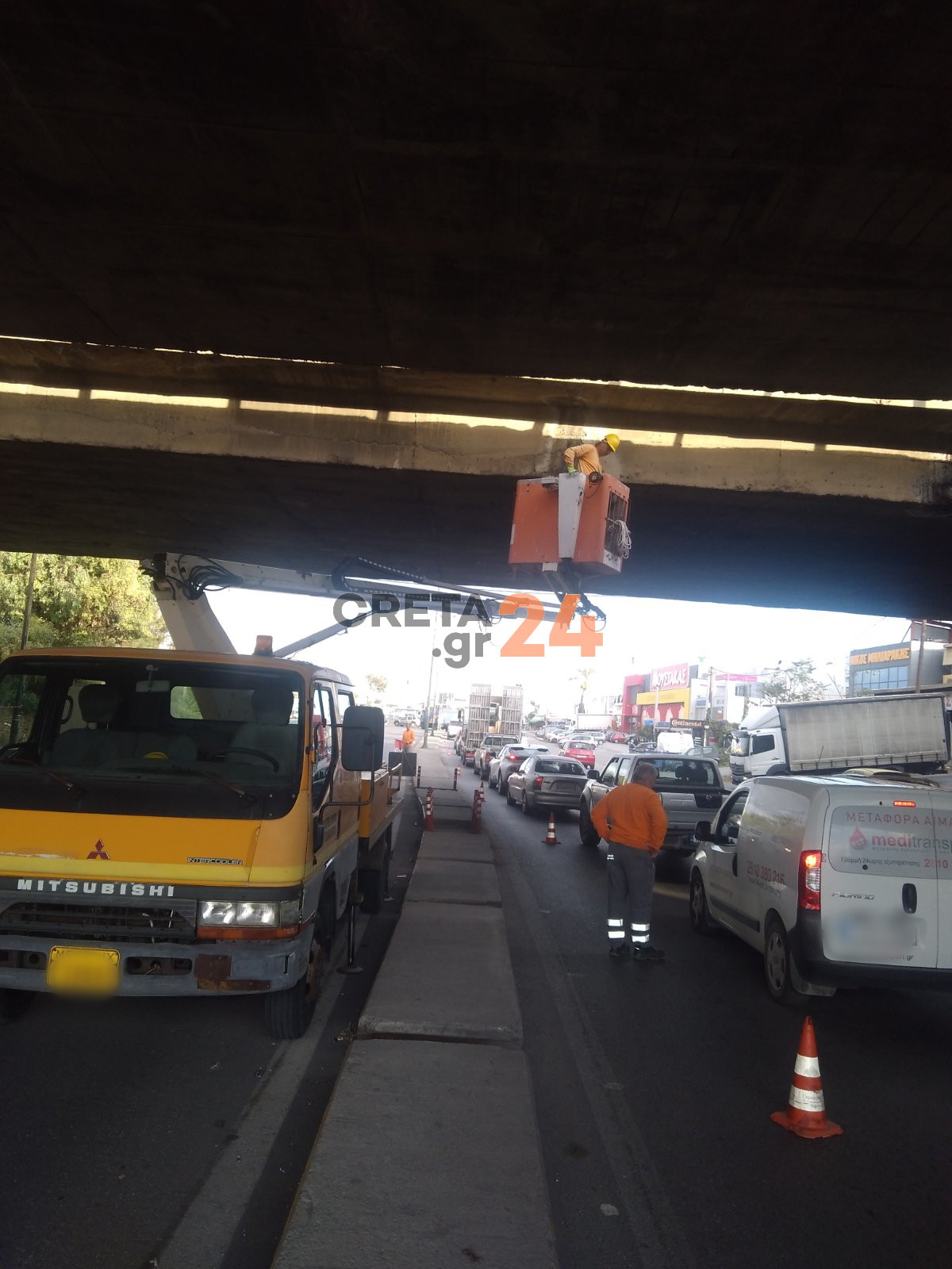 Εργασίες συντήρησης στην «πληγωμένη» γέφυρα στη Λεωφόρο Καζαντζίδη στο Ηράκλειο, πραγματοποιεί η τεχνική υπηρεσία της Περιφέρειας Κρήτης, για να… προλάβει τα χειρότερα.