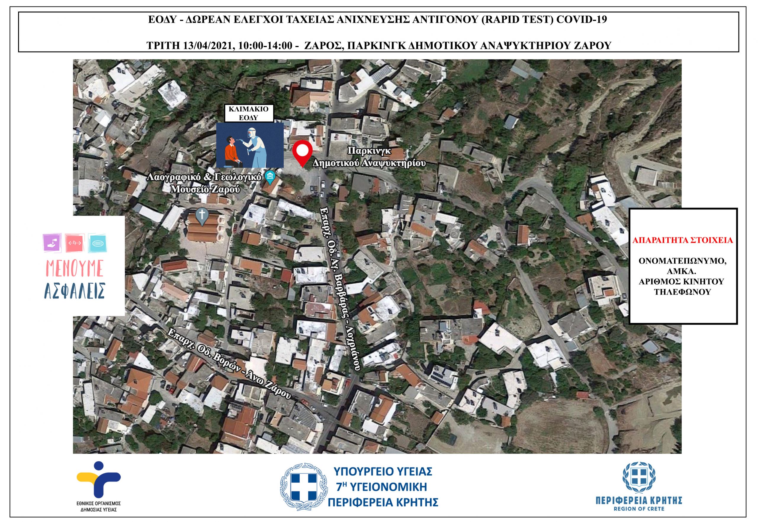 Πιο συγκεκριμένα από τις 10:00 έως τις 14:00 θα διενεργούνται rapid tests σε κατοίκους του Ζαρού στο πάρκινγκ του Δημοτικού Αναψυκτηρίου.