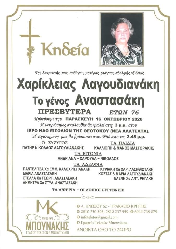 Σε ηλικία 76 ετών έφυγε από τη ζωή η Χαρίκλεια Λαγουδιανάκη, πρεσβυτέρα του π. Νικόλαου Λαγουδιανάκη, βυθίζοντας στο πένθος συγγενείς και φίλους.