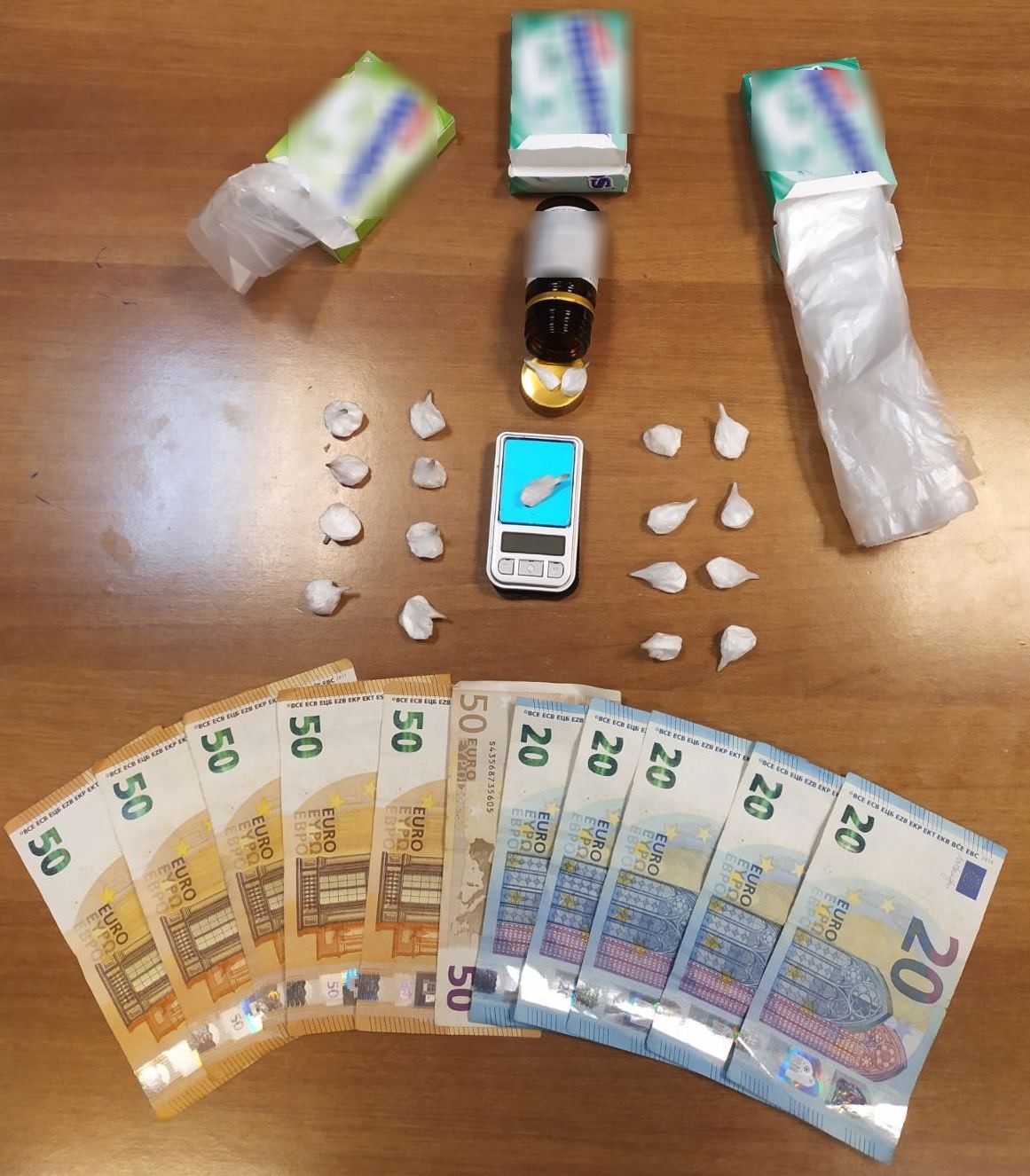 Κατά την διάρκεια της έρευνας βρέθηκαν συνολικά και κατασχέθηκαν, 17 αυτοσχέδιες συσκευασίες περιέχουσες ποσότητα κοκαΐνης βάρους 8,5 γραμμαρίων, ζυγαριά ακριβείας, το χρηματικό ποσό των 400 ευρώ ως προερχόμενο από παράνομες δραστηριότητες και πλήθος από νάιλον σακουλάκια συσκευασίας.