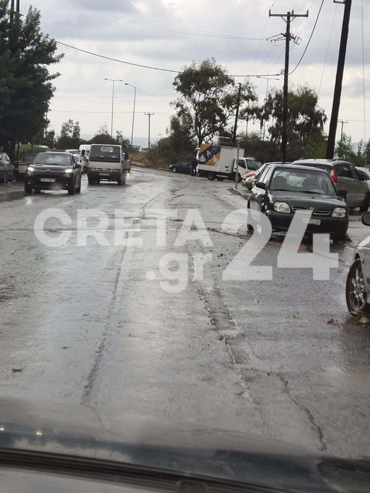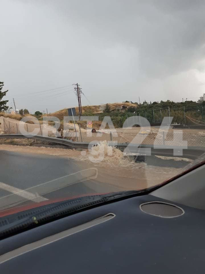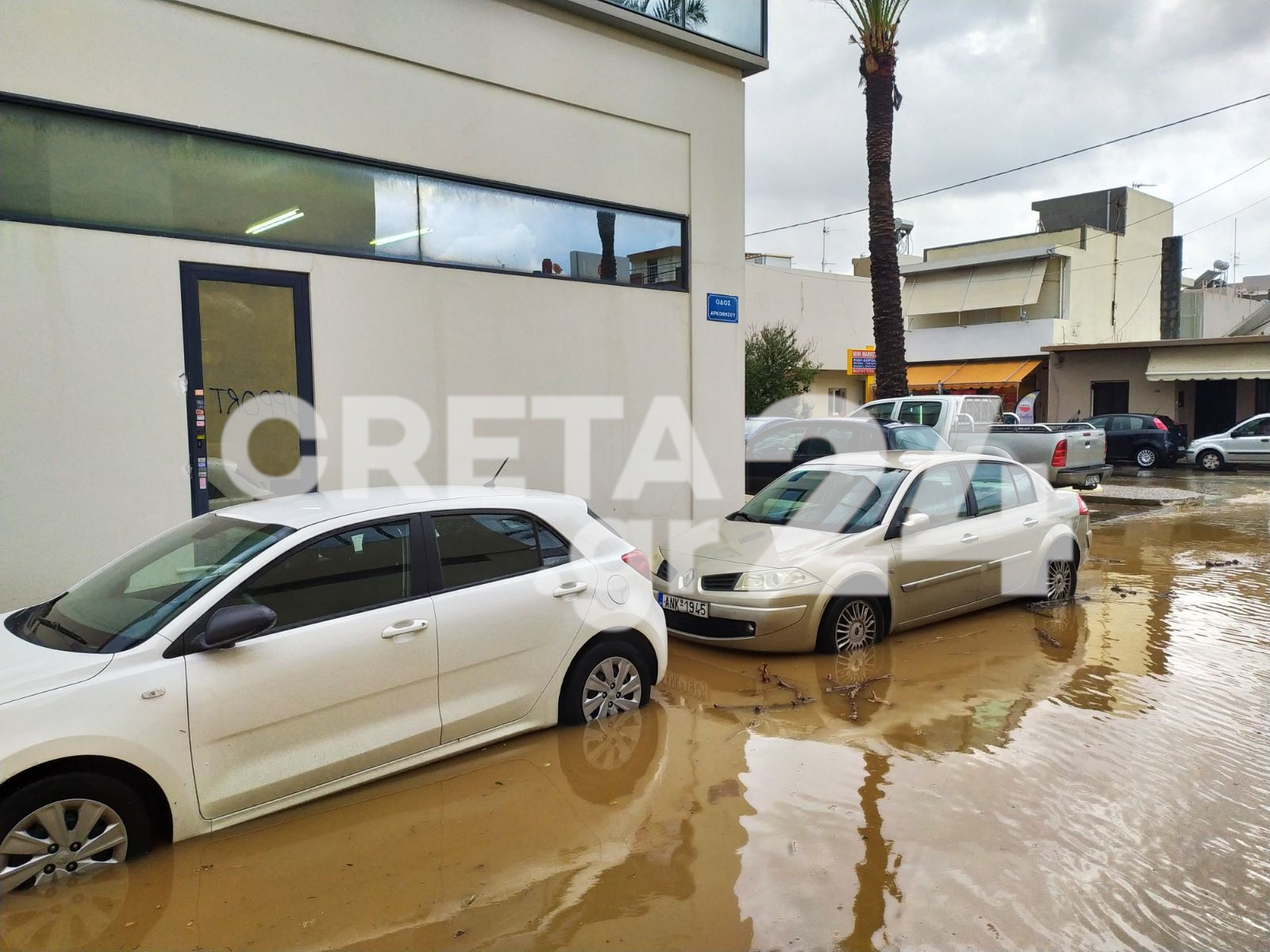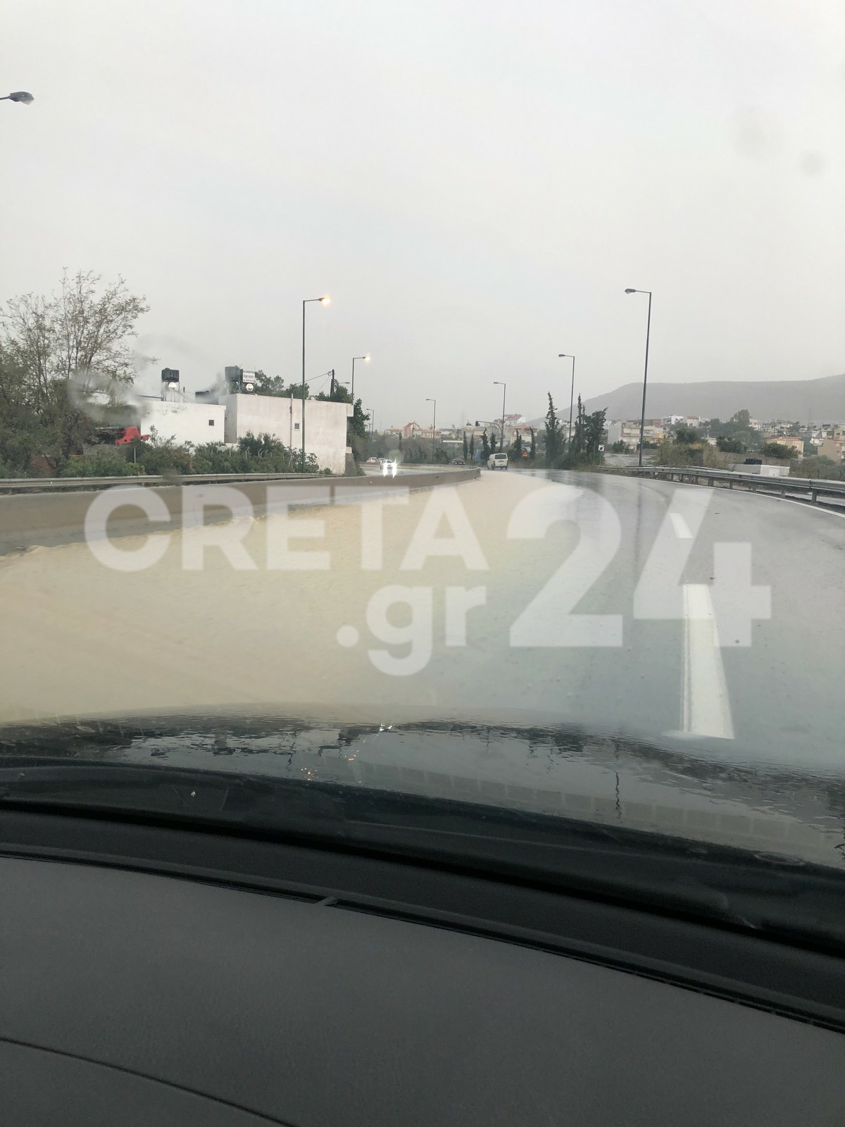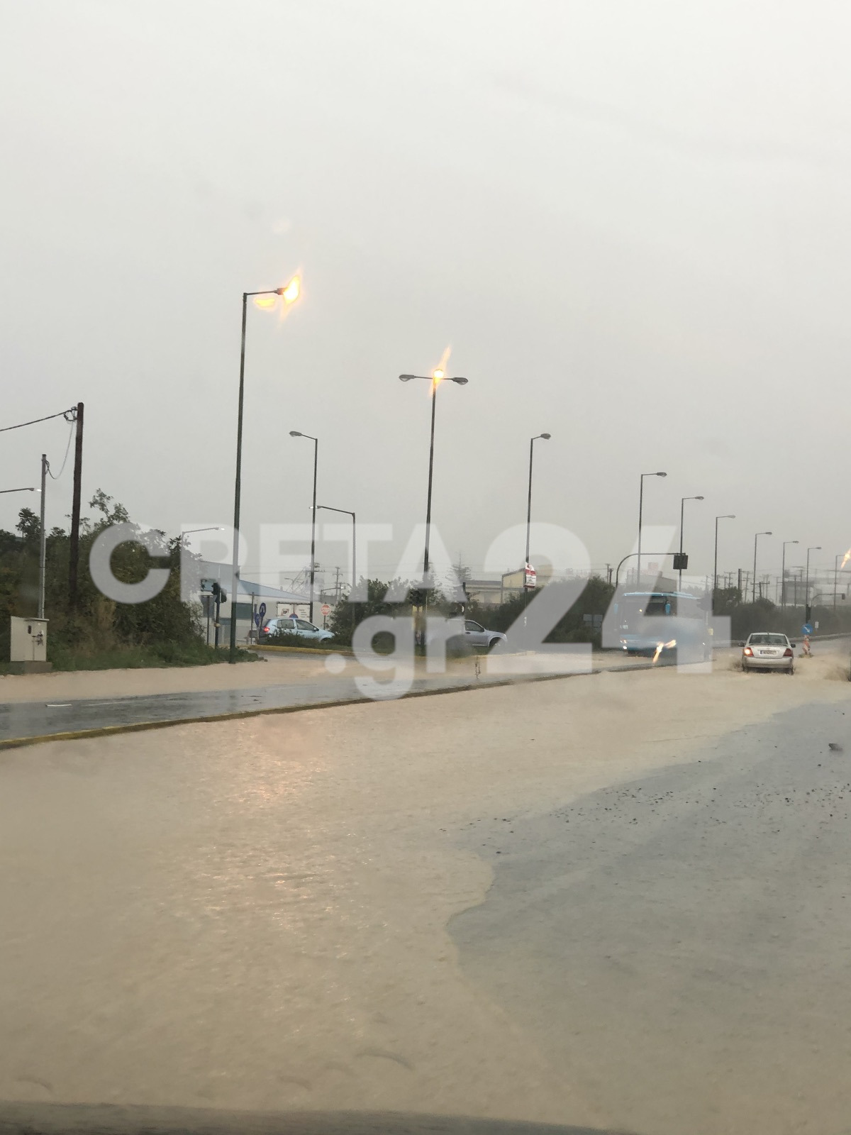 Χείμαρροι έχουν δημιουργηθεί σε πολλούς δρόμους της περιοχής, ωστόσο μεγαλύτερο πρόβλημα υπάρχει στον κόμβο Κατσαμπά που η στάθμη του νερού έχει καλύψει οχήματα.