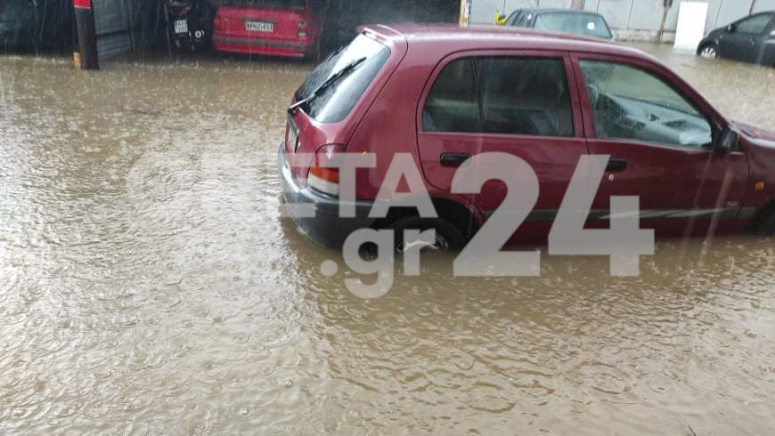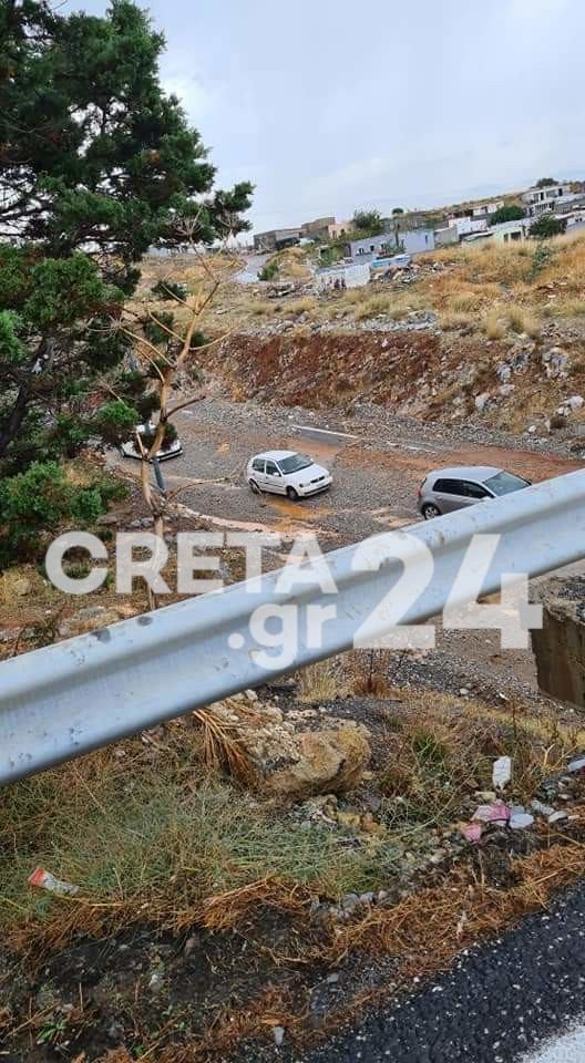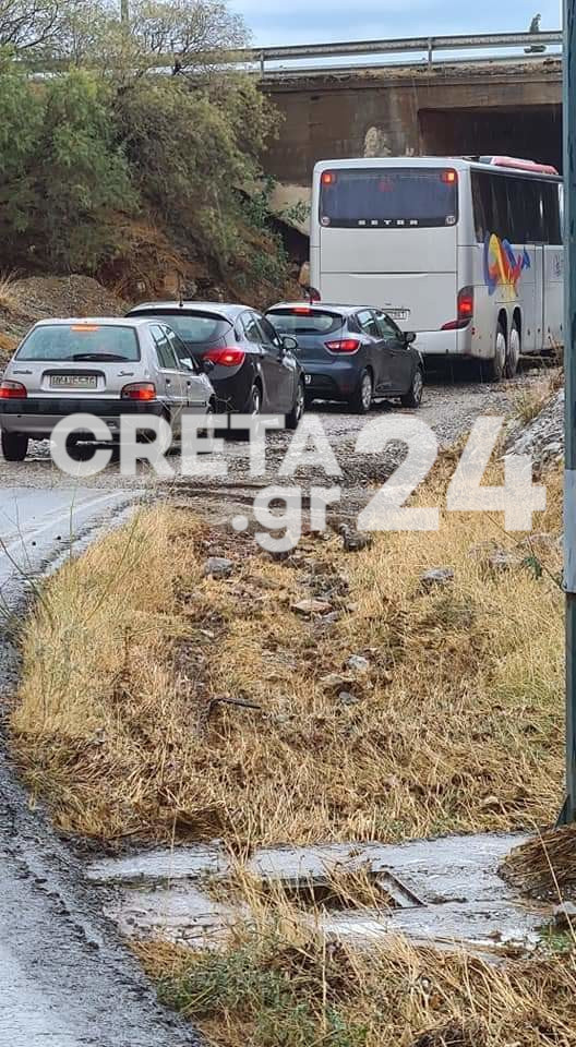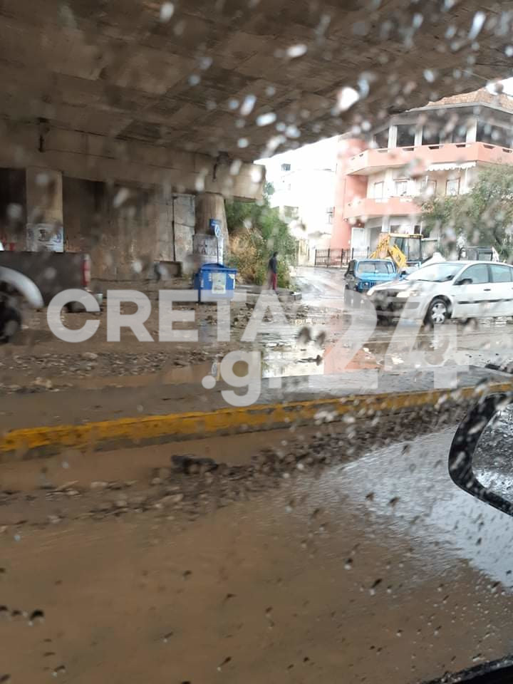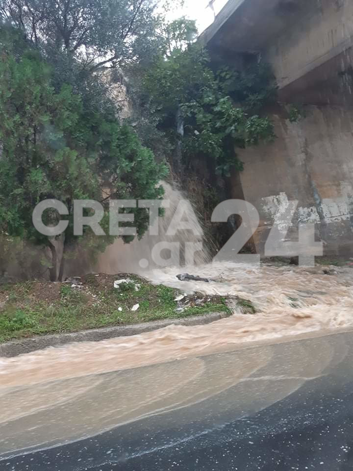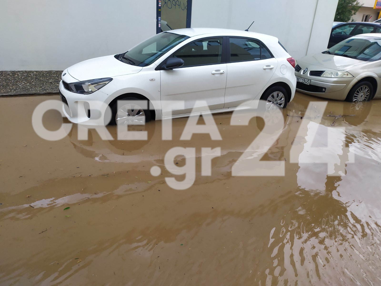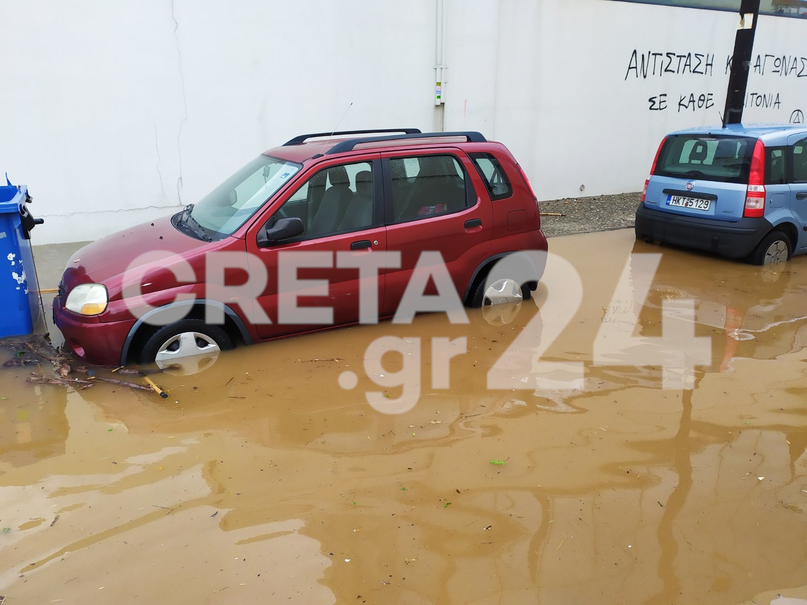 Χείμαρροι έχουν δημιουργηθεί σε πολλούς δρόμους της περιοχής, ωστόσο μεγαλύτερο πρόβλημα υπάρχει στον κόμβο Κατσαμπά που η στάθμη του νερού έχει καλύψει οχήματα.