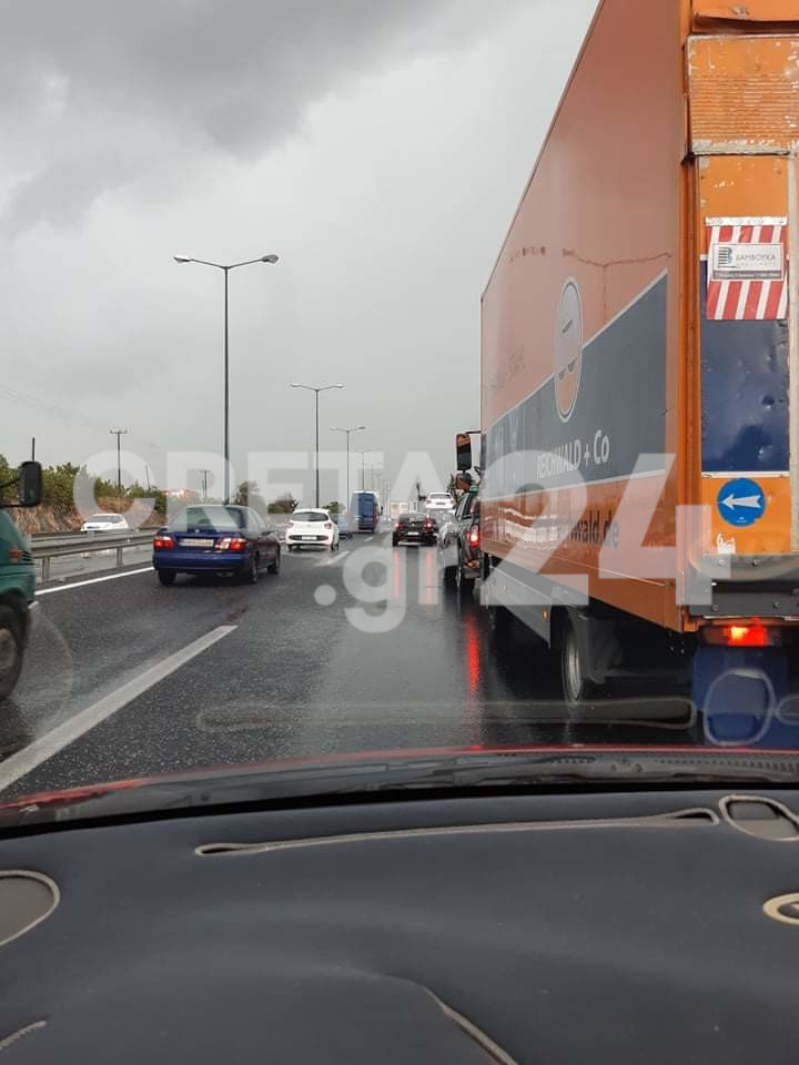 Με αρκετό νερό και δυσκολία η κίνηση στην εθνική οδό μετά τη λεωφόρο Καζαντίδη: