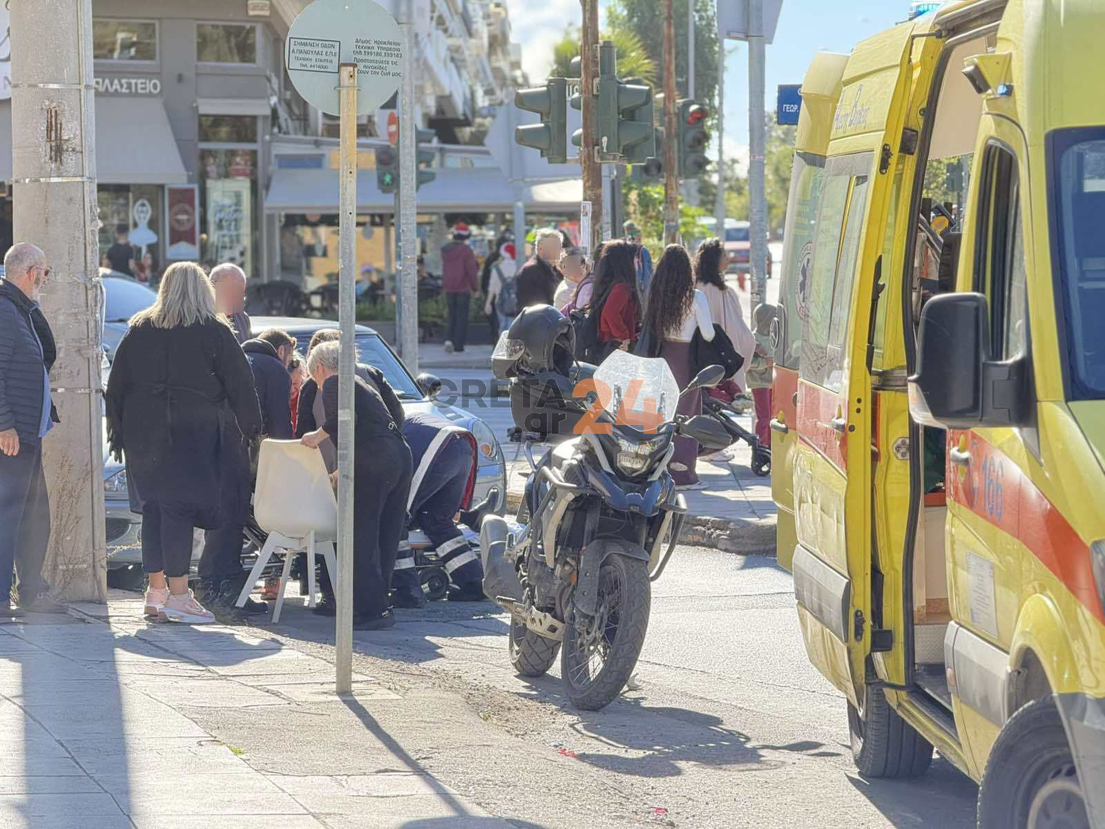 Όπως βλέπετε και στις φωτογραφίες που δημοσιεύει το Creta24.gr, άμεσα στο σημείο έσπευσαν περαστικοί που είδαν το περιστατικό, βοήθησαν την άτυχη γυναίκα να σηκωθεί, ενώ ενημέρωσαν το ΕΚΑΒ, το οποίο με ασθενοφόρο έφτασε στο σημείο, την παρέλαβε μεταφέροντας την στο ΠΑΓΝΗ