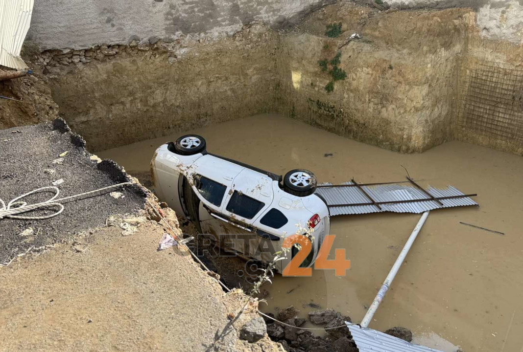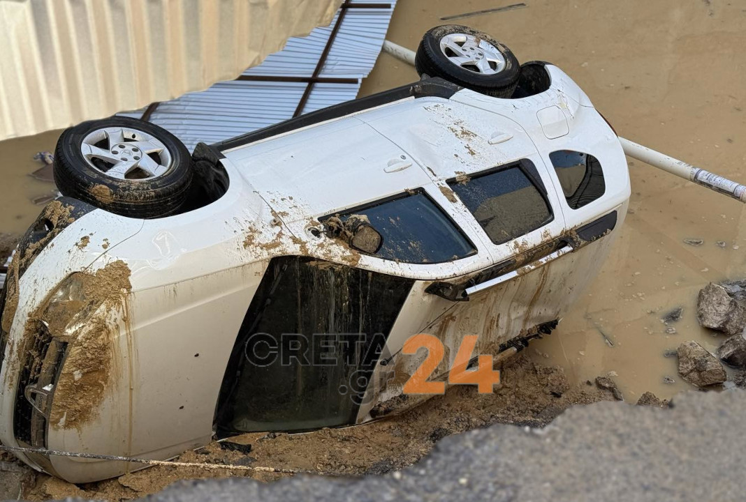 Το περιστατικό σημειώθηκε στην οδό Φωτάκη, κάθετη της λεωφόρου Δημοκρατίας, στο κέντρο του Ηρακλείου, όταν το οδόστρωμα υποχώρησε, με αποτέλεσμα το σταθμευμένο όχημα να καρφωθεί αρχικά μέσα στην λακκούβα που δημιουργήθηκε.