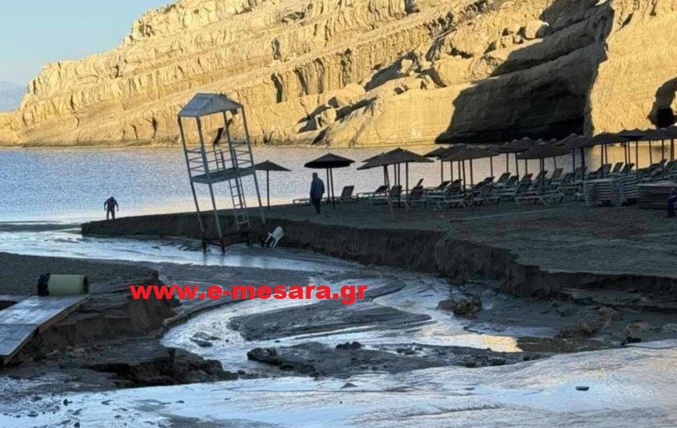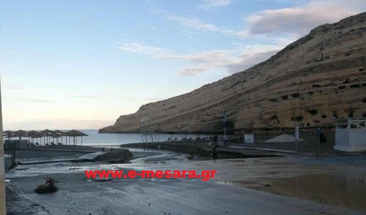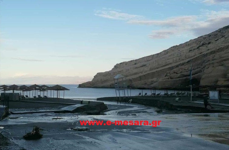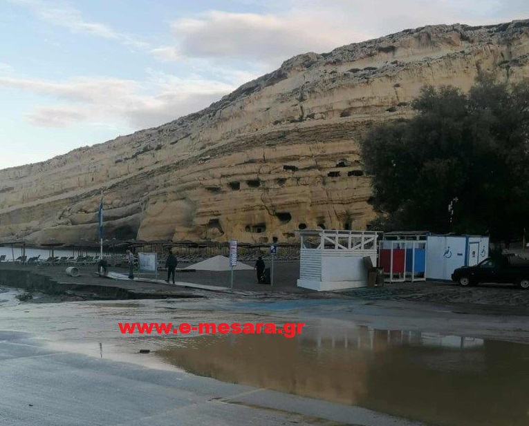 Ο χείμαρρος που διασχίζει τα Μάταλα – γνωστός ως Ματαλιώτης ποταμός ή ποταμός του Αγίου Στεφάνου – φούσκωσε από τα ορμητικά νερά και υπερχείλισε, με αποτέλεσμα να πλημμυρίσει το πάρκινγκ, φαινόμενο που παρατηρείται συχνά σε περιόδους έντονων βροχοπτώσεων.