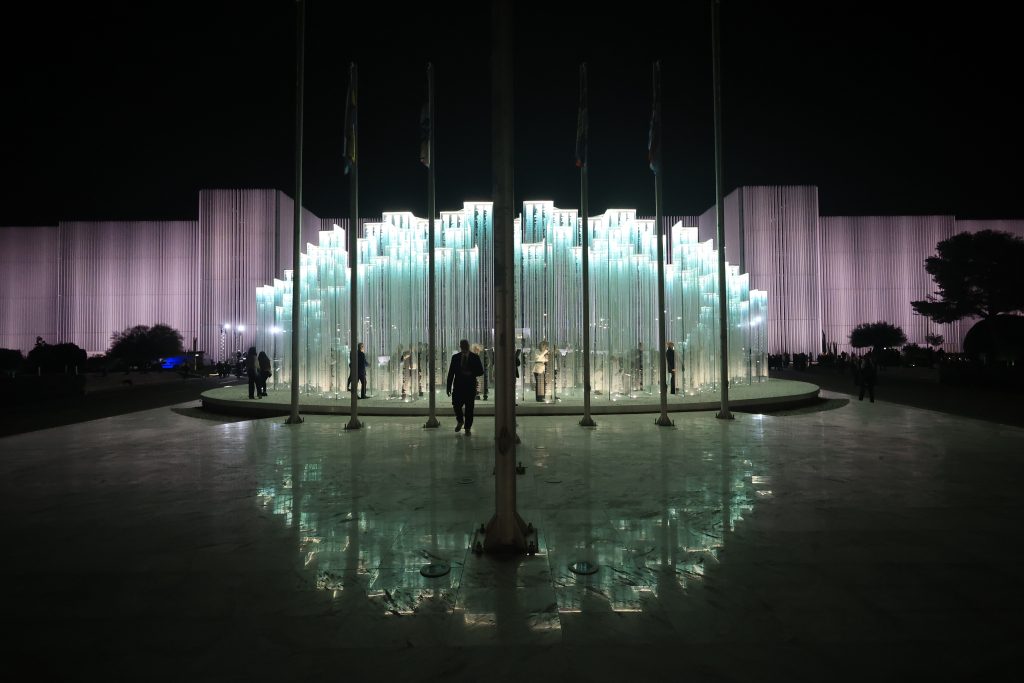 Τα ονόματα «αιωρούνται στον χώρο», ενώ και ο βραδινός φωτισμός των γυαλιών τους προσδίδει ιδιαίτερες χρωματικές ανταύγειες.