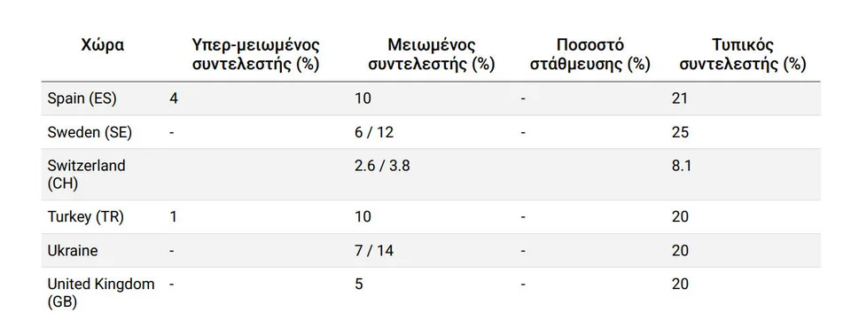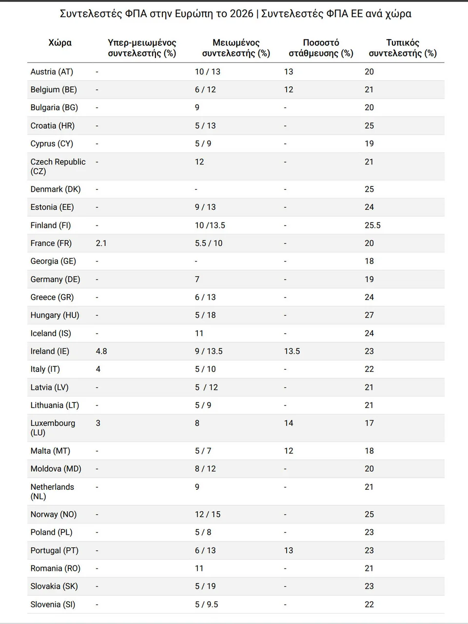 Πολλές ευρωπαϊκές χώρες έχουν κάνει αλλαγές στους συντελεστές ΦΠΑ τους από πέρυσι. Η Αυστρία μηδενίζει ορισμένα προϊόντα υγιεινής από το 2026. Η Εσθονία αύξησε τον κανονικό συντελεστή της από 22% σε 24% τον Ιούλιο του 2025. Η Γερμανία διαβρώνει τη βάση ΦΠΑ μετακινώντας τα τρόφιμα στα εστιατόρια από τον κανονικό συντελεστή 19% σε μειωμένο συντελεστή 7% από το 2026. Η Ελλάδα επέκτεινε τη μείωση 30% σε όλους τους συντελεστές ΦΠΑ σε περισσότερα νησιά. Η Λιθουανία διεύρυνε τη βάση ΦΠΑ μετακινώντας ορισμένα είδη με μειωμένο συντελεστή από το 9% στο 12%, μια αντιστροφή προηγούμενων αλλαγών πολιτικής το 2023. Η Ολλανδία μετέφερε τις υπηρεσίες διαμονής από τον μειωμένο συντελεστή 9% στον κανονικό συντελεστή 21%. Η Φινλανδία μείωσε περαιτέρω τον μειωμένο συντελεστή της από 14% σε 13,5%, διευρύνοντας το χάσμα στο κανονικό συντελεστή 25,5%. Η Ρουμανία αύξησε τον κανονικό συντελεστή της από 19% σε 21% τον Αύγουστο του 2025 και ενοποίησε τα κλιμάκια 5% και 9% σε έναν ενιαίο μειωμένο συντελεστή 11%.