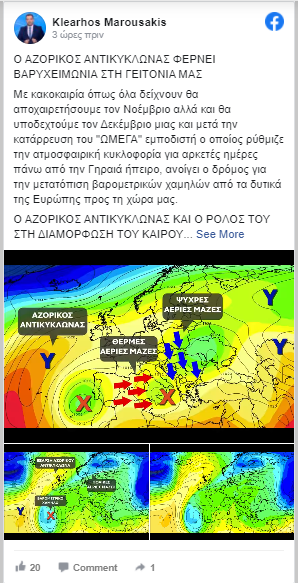 «Με κακοκαιρία όπως όλα δείχνουν θα αποχαιρετήσουμε τον Νοέμβριο αλλά και θα υποδεχτούμε τον Δεκέμβριο μιας και μετά την κατάρρευση του “ΩΜΕΓΑ” εμποδιστή ο οποίος ρύθμιζε την ατμοσφαιρική κυκλοφορία για αρκετές ημέρες πάνω από την Γηραιά ήπειρο, ανοίγει ο δρόμος για την μετατόπιση βαρομετρικών χαμηλών από τα δυτικά της Ευρώπης προς τη χώρα μας.