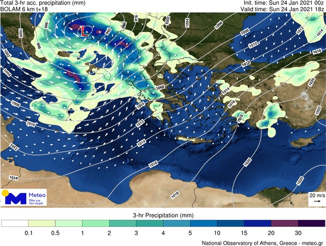 Σύμφωνα με τα προγνωστικά στοιχεία του Εθνικού Αστεροσκοπείου Αθηνών/meteo.gr, νέο μέτωπο κακοκαιρίας με παρόμοια χαρακτηριστικά, θα επηρεάσει μετά το μεσημέρι της Κυριακής 24/01 τη Δυτική Ελλάδα και προοδευτικά έως το πρωί της Δευτέρας 25/01 το σύνολο της χώρας.