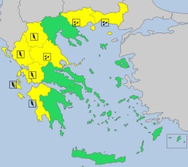 O προγνωστικός χάρτης του MeteoAlarm για τον καιρό της Τρίτης: