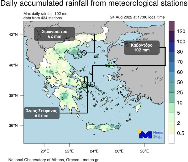 Σύμφωνα με δεδομένα από το δίκτυο αυτόματων μετεωρολογικών σταθμών του Εθνικού Αστεροσκοπείου Αθηνών/meteo.gr, το μεγαλύτερο ύψος βροχής στην χώρα μας ήταν ίσο με 102 χιλιοστά και καταγράφηκε στον μετεωρολογικό σταθμό στο Κάβοντορο.