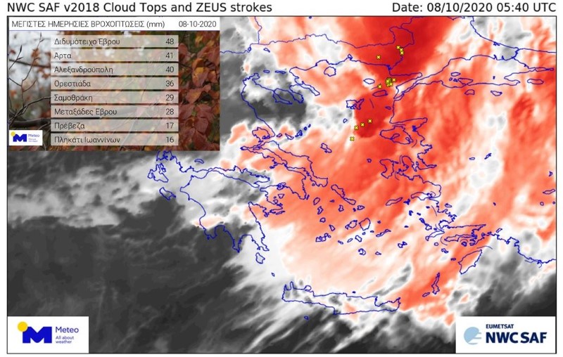 «Τις πρωινές ώρες της Πέμπτης 08/10 το ψυχρό μέτωπο που είναι υπεύθυνο για τη μεταβολή του καιρού, επηρεάζει τα ανατολικά ηπειρωτικά τμήματα της χώρας και τα νησιωτικά τμήματα του Αιγαίου. Στη δορυφορική εικόνα που ακολουθεί απεικονίζεται το μέτωπο στις 08:40 το πρωί της Πέμπτης, ενώ με κίτρινους αστερίσκους σημειώνονται οι περιοχές όπου εκδηλώνονται καταιγίδες. Στην εικόνα περιέχεται ο πίνακας με τα 8 μεγαλύτερα ύψη βροχόπτωσης, σύμφωνα με το δίκτυο αυτόματων μετεωρολογικών σταθμών του Εθνικού Αστεροσκοπείου Αθηνών / meteo.gr.»