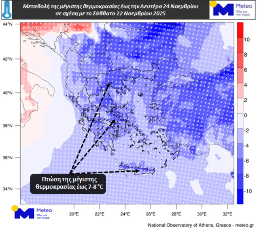 Στον σχετικό χάρτη παρουσιάζεται η πτώση της μέγιστης θερμοκρασίας έως τη Δευτέρα 24/11 σε σχέση με τις μέγιστες που αναμένονται το μεσημέρι του Σαββάτου 22/11. Όπως φαίνεται σε αυτόν, η συνολική πτώση στα ηπειρωτικά και στην Κρήτη θα φτάσει τοπικά τους 7-8 °C με αποτέλεσμα η θερμοκρασία τη Δευτέρα 24/11 να αναμένεται να μην ξεπεράσει τους 15-17 °C στα ηπειρωτικά και τις κεντρικές και βόρειες νησιωτικές περιοχές και τους 17-19 °C στις Κυκλάδες, στα Δωδεκάνησα και στην Κρήτη.