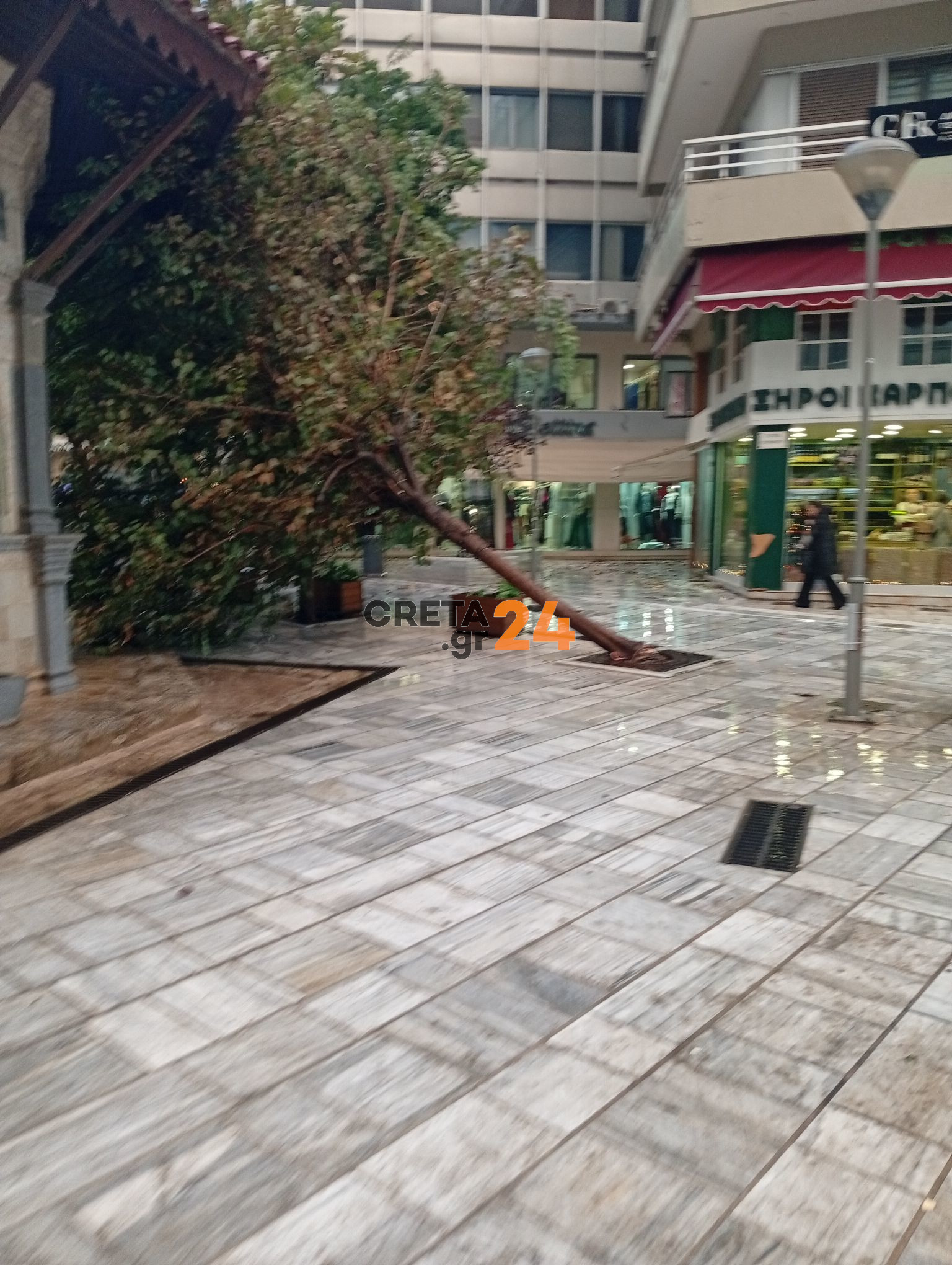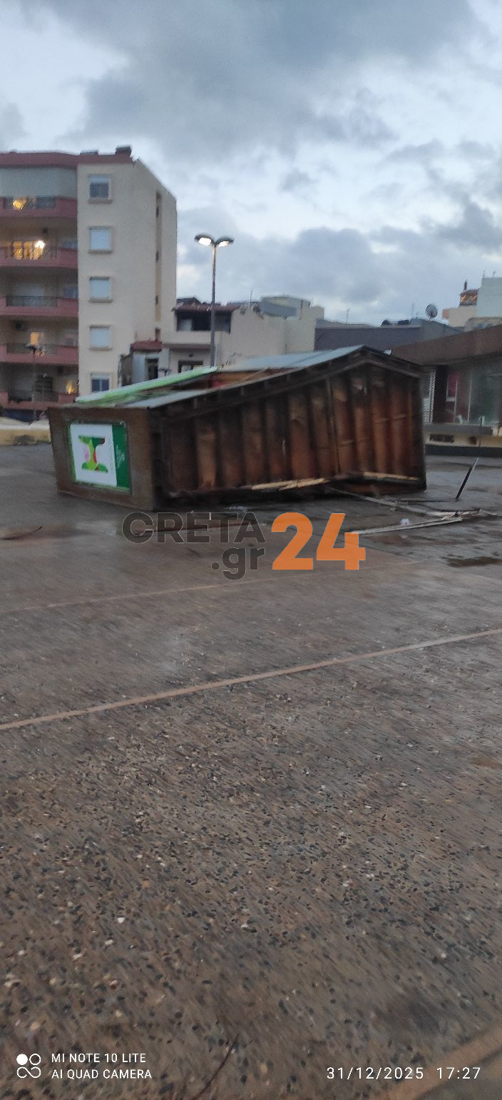 Στην Πλατεία Κορνάρου, τμήματα από στέγαστρα έπεσαν στο έδαφος από τους ισχυρούς ανέμους και τις βροχοπτώσεις σήμερα το απόγευμα (31/12). Σημειώθηκε επίσης πτώση δέντρου και κλαδιών, χωρίς ευτυχώς να υπάρξουν τραυματισμοί.