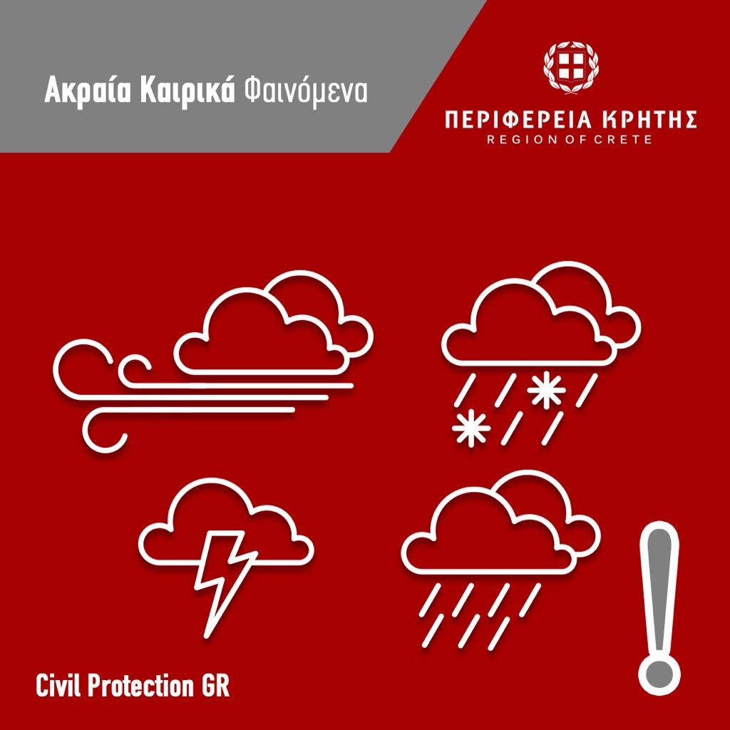 Με ανακοίνωσή της η Πολιτική Προστασία Περιφέρειας Κρήτης ενημερώνει ότι όλες οι Υπηρεσίες του Μηχανισμού Πολιτικής Προστασίας έχουν τεθεί σε κατάσταση κινητοποίησης Red Code από τις βραδινές ώρες της Δευτέρας 26.01.2026 ως και σήμερα Τρίτη 27.01.2026, καθώς προβλέπεται επιδείνωση του καιρού με κύρια χαρακτηριστικά τις κατά τόπους ισχυρές βροχές και καταιγίδες.