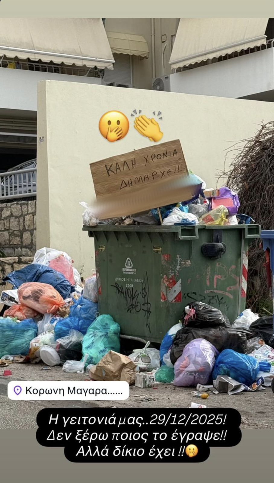 Μάλιστα στην περιοχή του Κορώνη Μαγαρά ένας πολίτης αποφάσισε να στείλει μήνυμα στον δήμαρχο Ηρακλείου, από το σημείο που… πονάει περισσότερο την πόλη. Έναν κάδο σκουπιδιών.