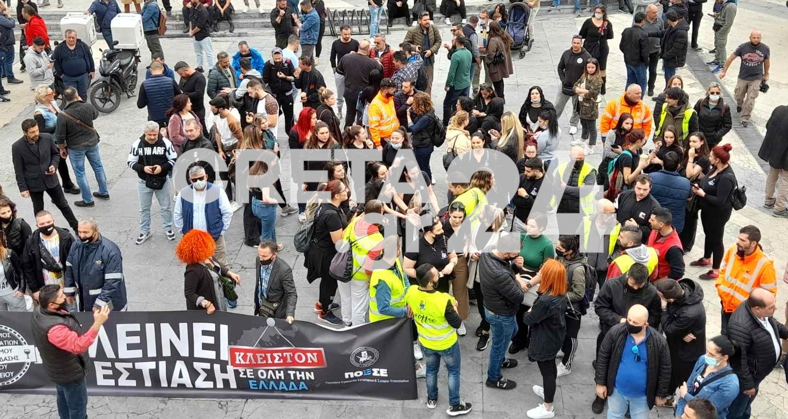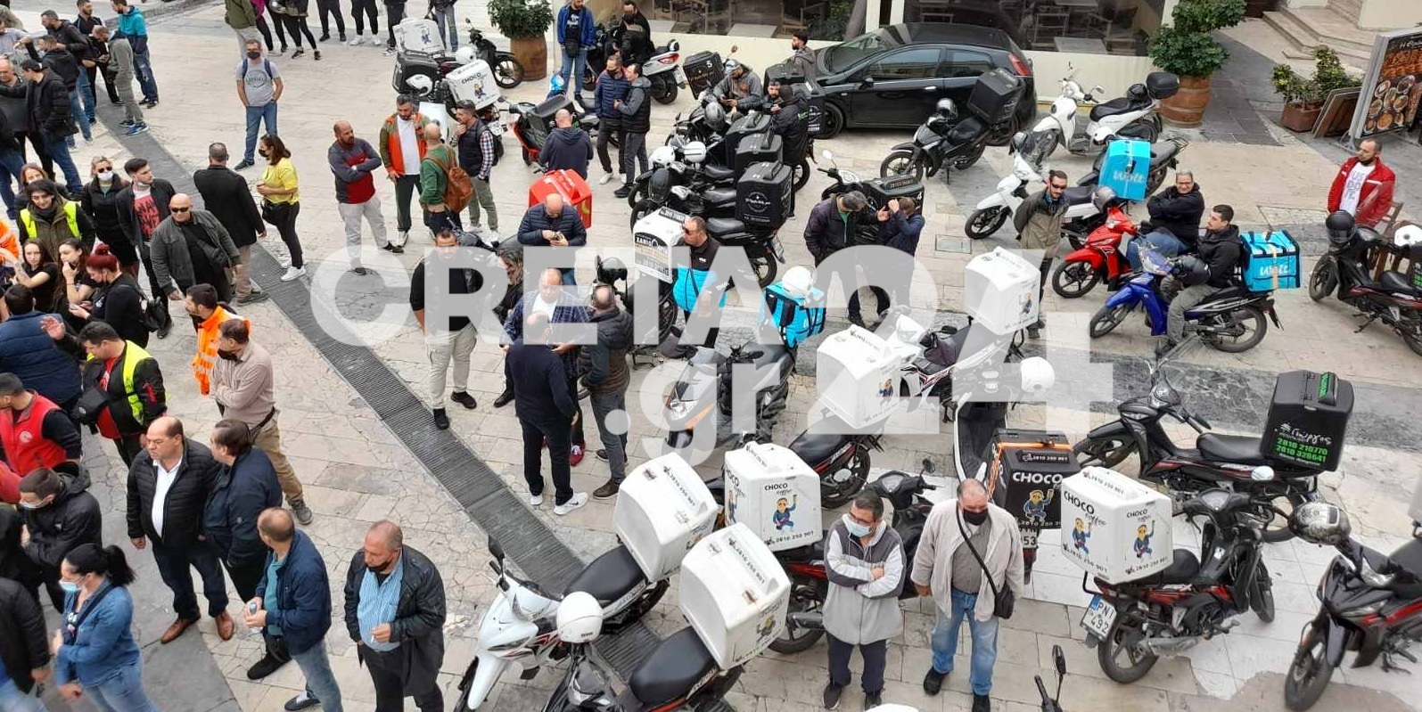 Οι εργαζόμενοι στην εστίαση ξεκίνησαν την πορεία τους από το Εργατικό Κέντρο Ηρακλείου, όπου είχαν συγκεντρωθεί νωρίτερα , όπως και οι διανομείς που έφτασαν με μηχανοκίνητη πορεία στην πλατεία Ελευθερίας.