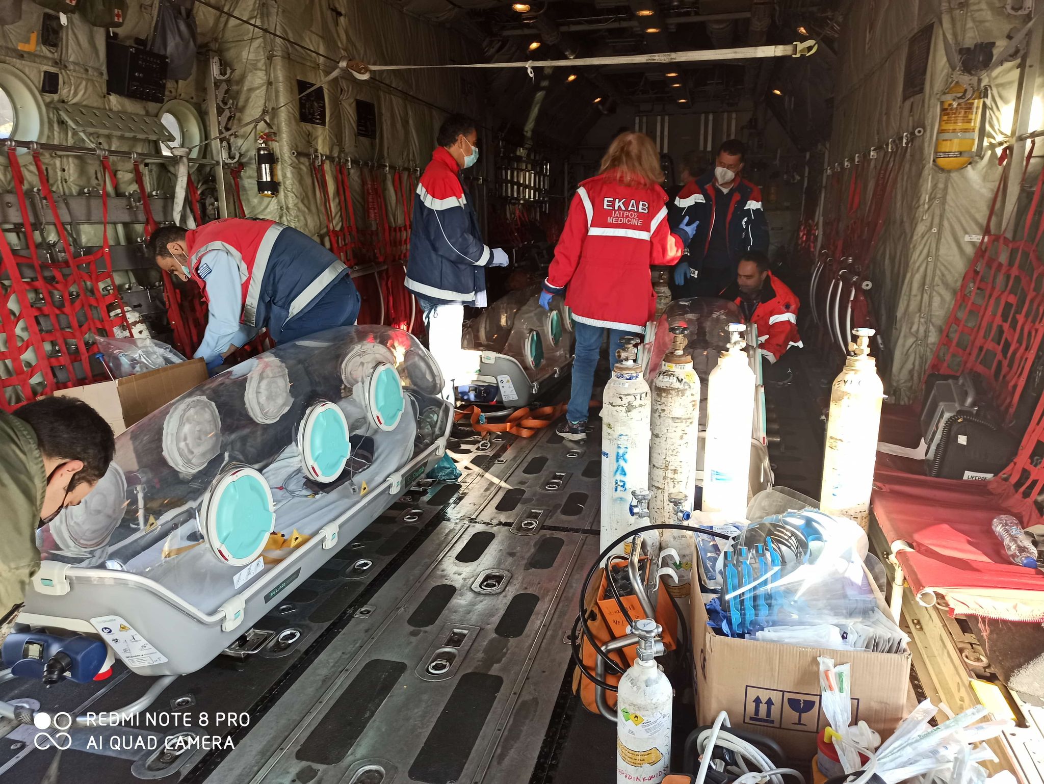 Σήμερα το πρωί στις 10:00, απογειώθηκε πτητική ομάδα του τμήματος Αεροδιακομιδών ΕΚΑΒ αποτελούμενη από τρεις ιατρούς και τρεις διασώστες με C-130 προκειμένου να διακομίσουν τρία διασωληνωμένα περιστατικά Covid-19 από το αεροδρόμιο της Καβάλας στην Αθήνα.