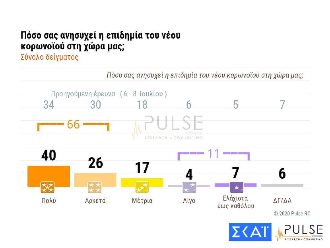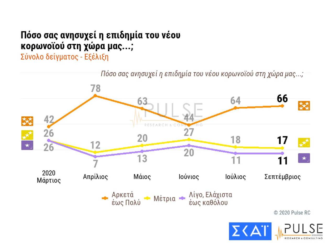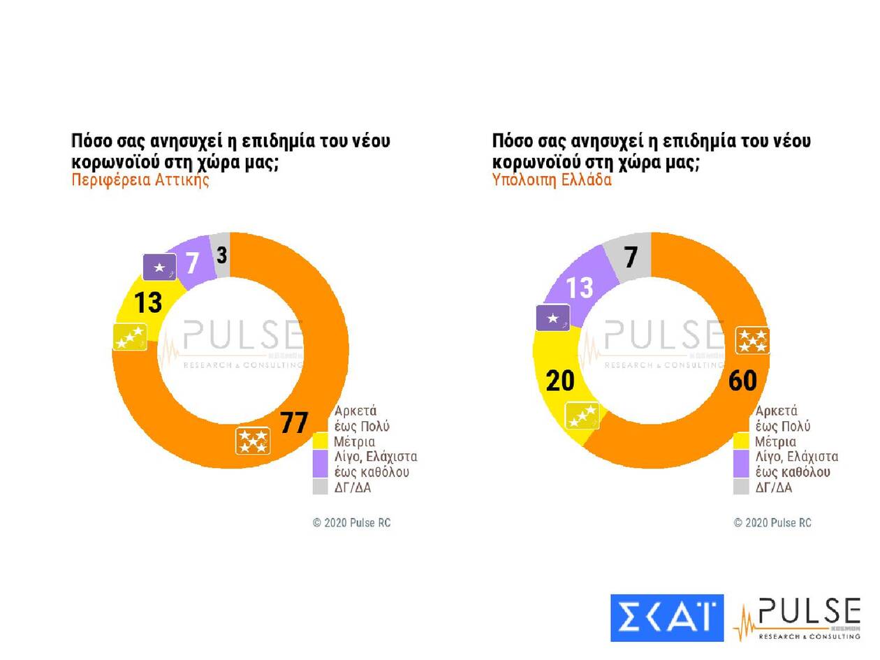 Στη δημοσκόπηση της Pulse και στην ερώτηση «πόσο σας ανησυχεί η επιδημία του νέου κορωνοϊού» το 40% απαντά «πολύ» και το 26% «αρκετά», ενώ ένα 7% απαντά «λίγο έως καθόλου». Ο προβληματισμός εκτοξεύεται στην Αττική, η οποία αποτελεί επίκεντρο της επιδημίας τις τελευταίες εβδομάδες, με το 77% να δηλώνει «αρκετά έως πολύ» ανήσυχο.