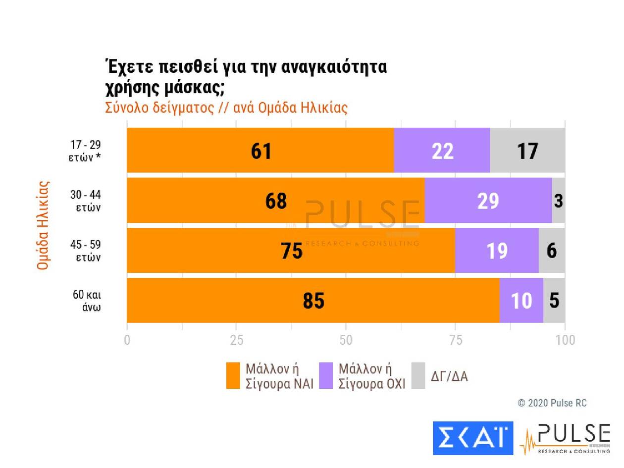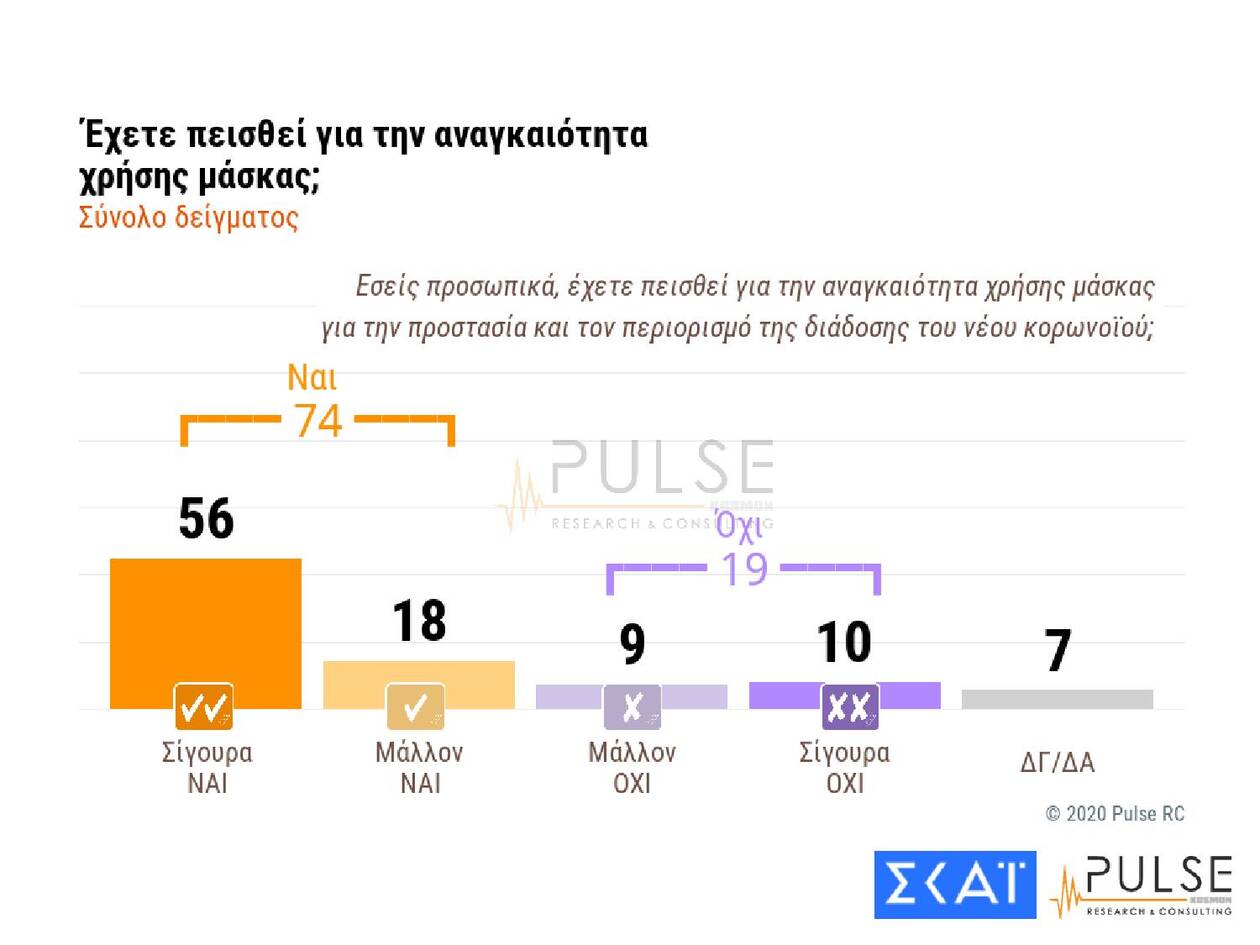 Σε ό,τι αφορά την αναγκαιότητα της χρήσης προστατευτικής μάσκας, το 57% απαντά «σίγουρα ναι», το 18% «μάλλον ναι», το 9% «μάλλον όχι», ενώ το 10% αρνείται κατηγορηματικά να πεισθεί ότι πρόκειται για απαραίτητο μέτρο προστασίας.