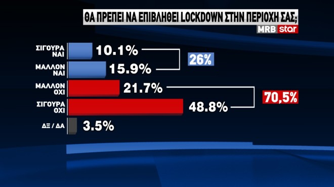 Αξιοσημείωτο είναι επίσης το εύρημα της MRB σχετικά με τη στάση των πολιτών στο ενδεχόμενο επιβολής ενός τοπικού lockdown, με το 70,5% να διαφωνεί και το 26% να συμφωνεί.