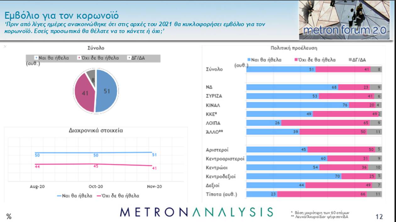 Σε ό,τι αφορά το εμβόλιο κατά του κορωνοϊού οι απόψεις εμφανίζονται διχασμένες. Στο ερώτημα «αν και κατά πόσο θα το κάνουν» το 51% απαντά «ναι, θα ήθελα», ενώ το 41% απαντά αρνητικά κι ένα 8% δηλώνει «δεν ξέρω / δεν απαντώ».