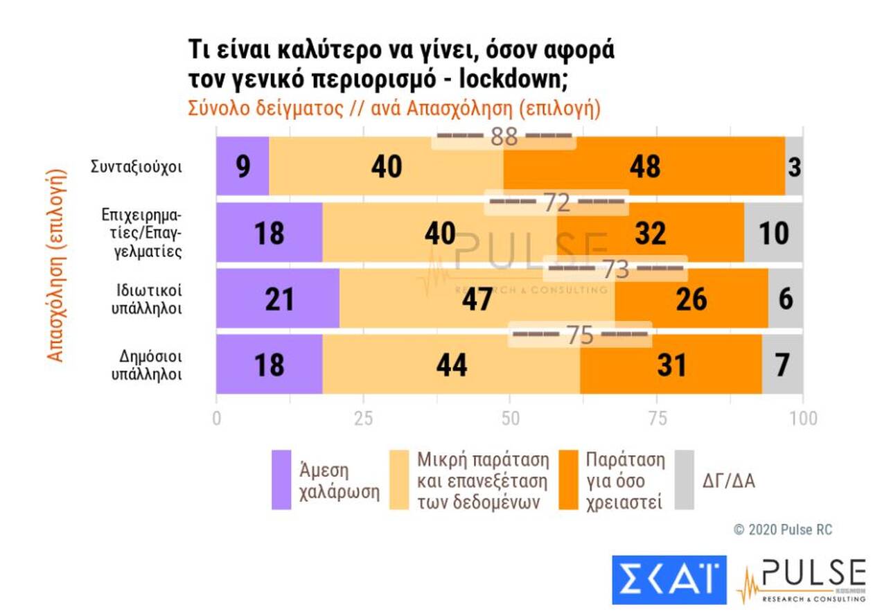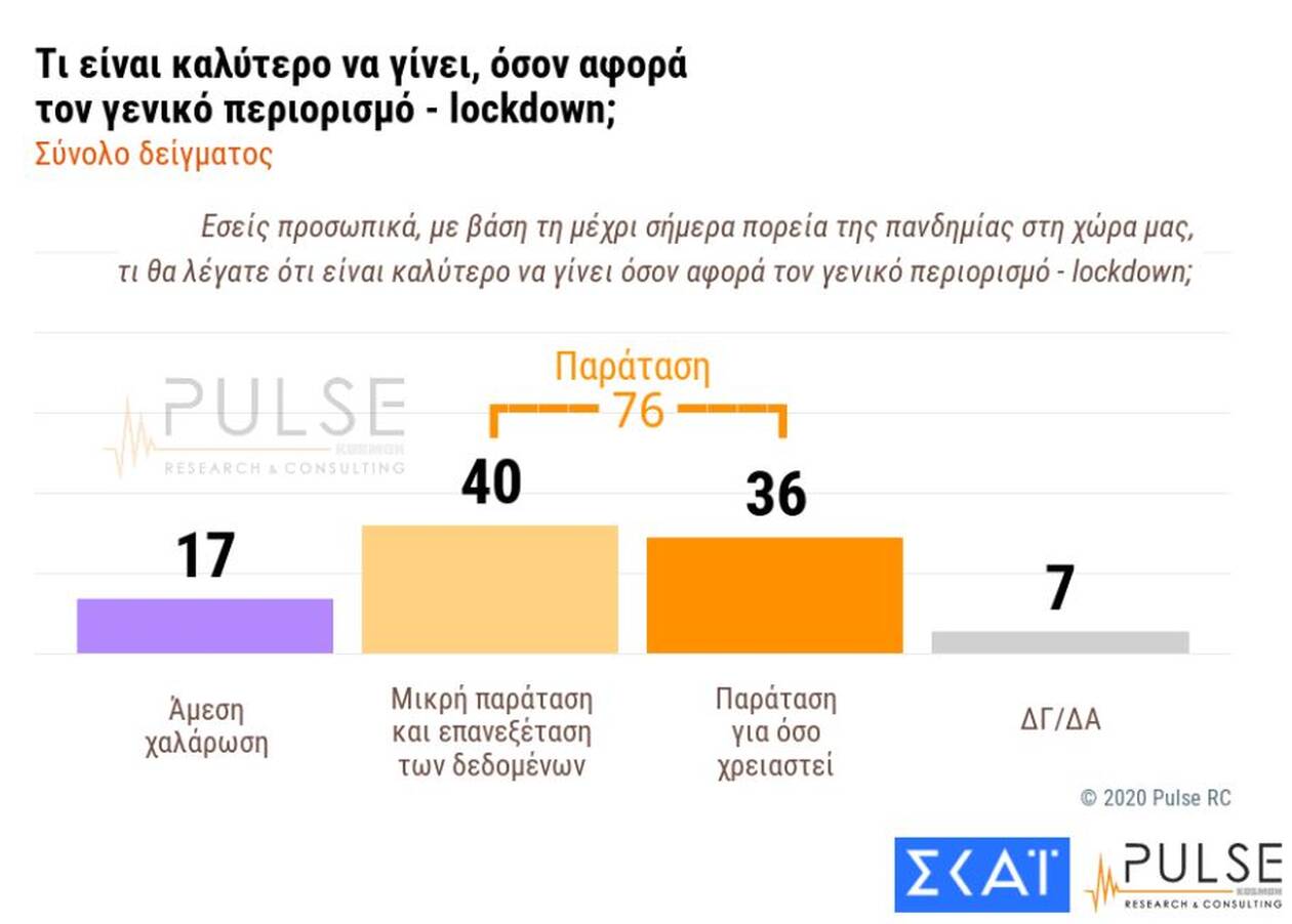 Αξιοσημείωτο είναι και το γεγονός ότι το 76% των ερωτηθέντων τάσσεται υπέρ της παράτασης του lockdown, έστω και βραχυχρόνια, ενώ ένα πολύ μικρό ποσοστό (17%) ζητά την άμεση χαλάρωση των περιοριστικών μέτρων.
