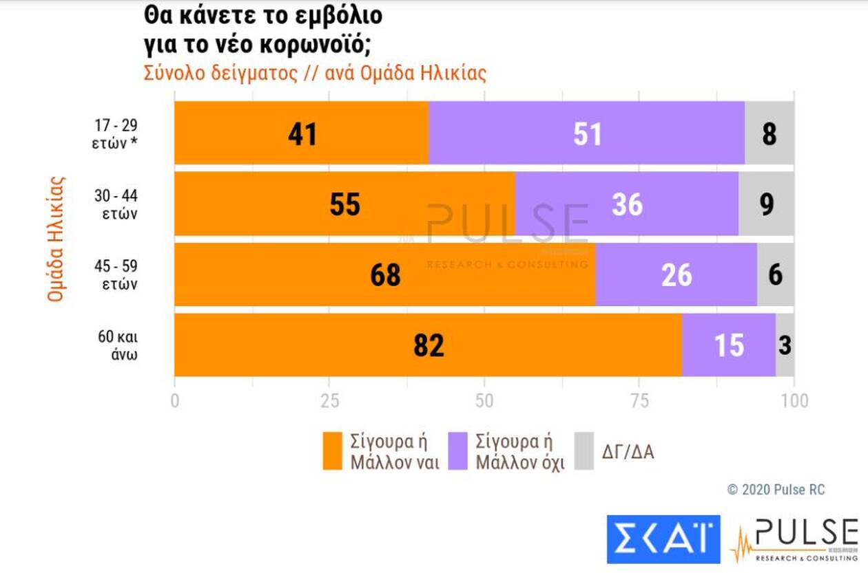 Στο ερώτημα «αν θα κάνετε το εμβόλιο κατά του κορωνοϊού», το 64% των ερωτηθέντων απαντά σίγουρα ναι ή μάλλον ναι, ενώ ένα 30%, απαντά μάλλον όχι και σίγουρα όχι.