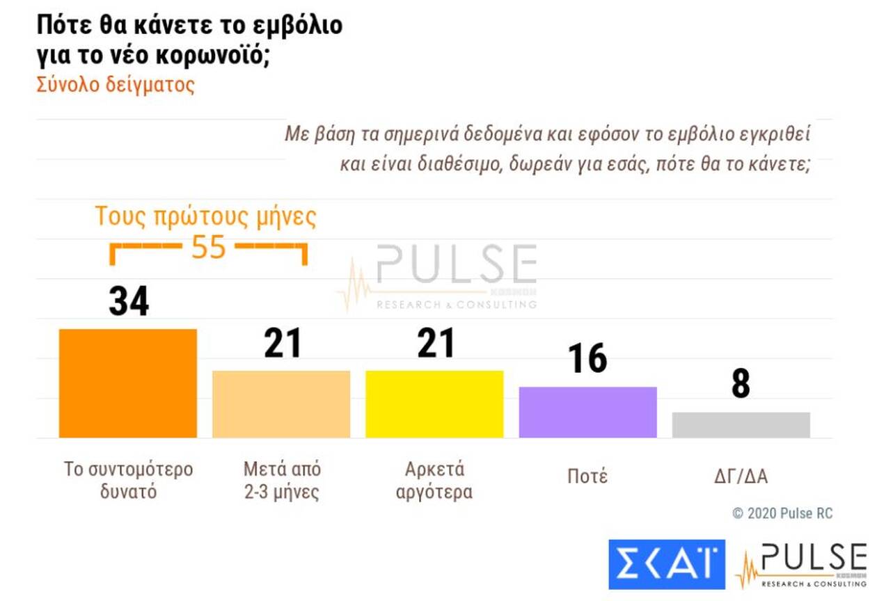 Εξάλλου, σε ερώτηση αναφορικά με την χρονική στιγμή που θα επιλέξουν να κάνουν το εμβόλιο, το 34% των ερωτηθέντων, απαντά άμεσα, το 21% μετά από 2-3 μήνες, το 21% απαντά αργότερα και ένα 16% απαντά ποτέ.