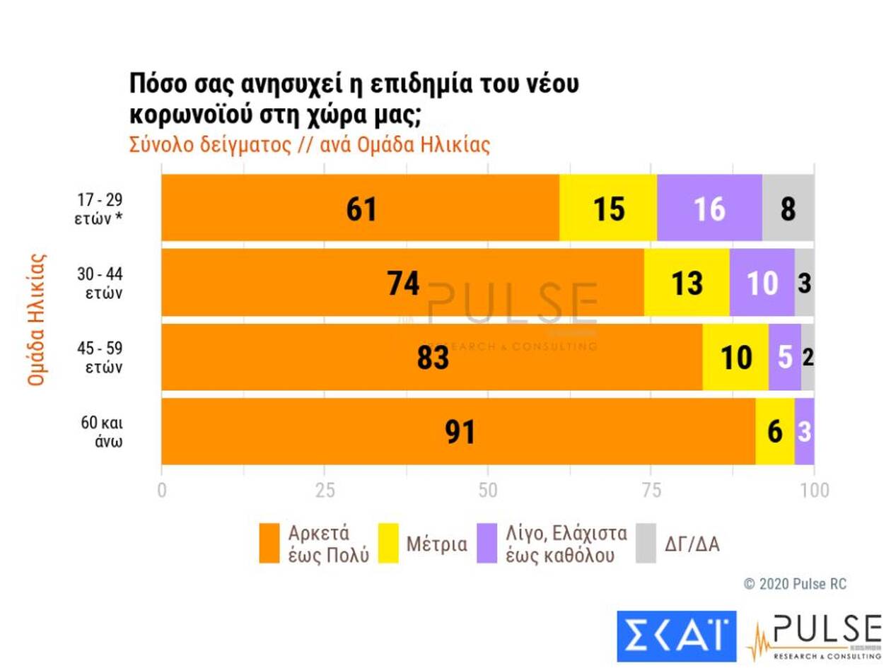 Στην ερώτηση «πόσο σας ανησυχεί η επιδημία του νεού κορωνοϊού στην Ελλάδα», το 52% των ερωτηθέντων δηλώνουν ότι ανησυχούν πολύ, το 26% αρκετά, το 11% μέτρια και το 8%, λίγο έως ελάχιστα.