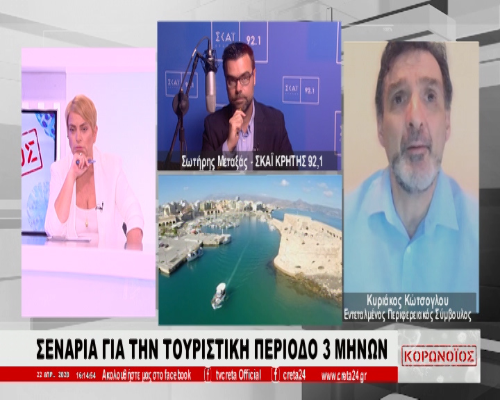 Όπως επισήμανε ο κ. Κώτσογλου «είμαστε σε επαφή με τους τουριστικούς φορείς. Υπάρχει η δυνατότητα για μια έρευνα πεδίου με ελέγχους στον πληθυσμό. Το συζητάμε αλλά και το κράτος πρέπει να κάνει ελέγχους. Εμείς είμαστε έτοιμοι για όλα. Έχουμε λύσεις και πρέπει να τις βάλουμε μπροστά. Η Κρήτη είναι ο πιο «καθαρός» προορισμός στην Ευρώπη και μπορεί να βάλει κανόνες για την επόμενη ημέρα στον τουρισμό. Το χειρότερο σενάριο δεν είναι να μην ανοίξουν τα ξενοδοχεία αλλά να ανοίξουν και να μπουν σε καραντίνα».