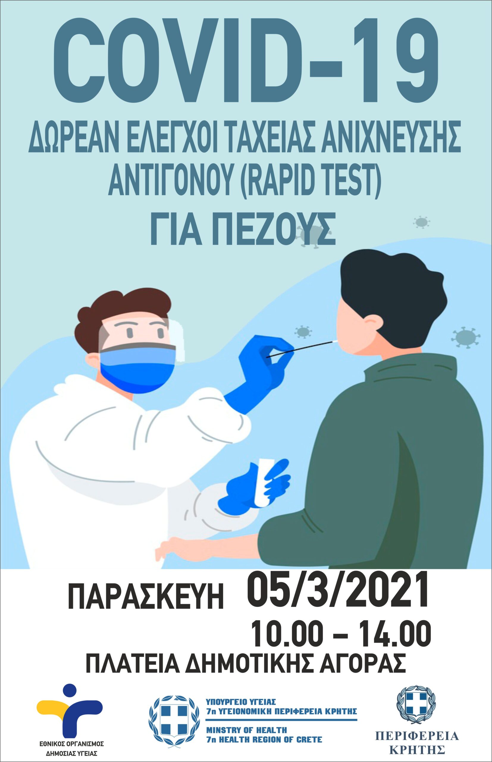 Σε δωρεάν rapid test για την ανίχνευση του COVID-19 σε πεζούς προχωρά ο ΕΟΔΥ την Παρασκευή 5 Μαρτίου 2021 στην πόλη των Χανίων, σε συνεργασία με την 7η ΥΠΕ, την Περιφέρεια Κρήτης / Περιφερειακή Ενότητα Χανίων και το Δήμο Χανίων.