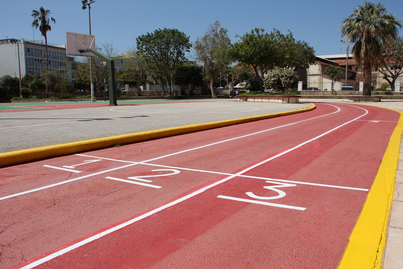 Κατά την επίσκεψή του στο 1ο Γυμνάσιο Χανίων, πλησίον της Δημοτικής Αγοράς, ο Δήμαρχος Χανίων παρακολούθησε την ολοκλήρωση των εργασιών στον προαύλιο χώρο της σχολικής μονάδας, διαπιστώνοντας ότι τα γήπεδα μπάσκετ, βόλεϊ και μπάντμιντον, καθώς και οι διαδρομές στίβου και το σκάμα που υπάρχουν στο χώρο, είχαν αναδειχθεί με έντονα και ζωηρά χρώματα.
