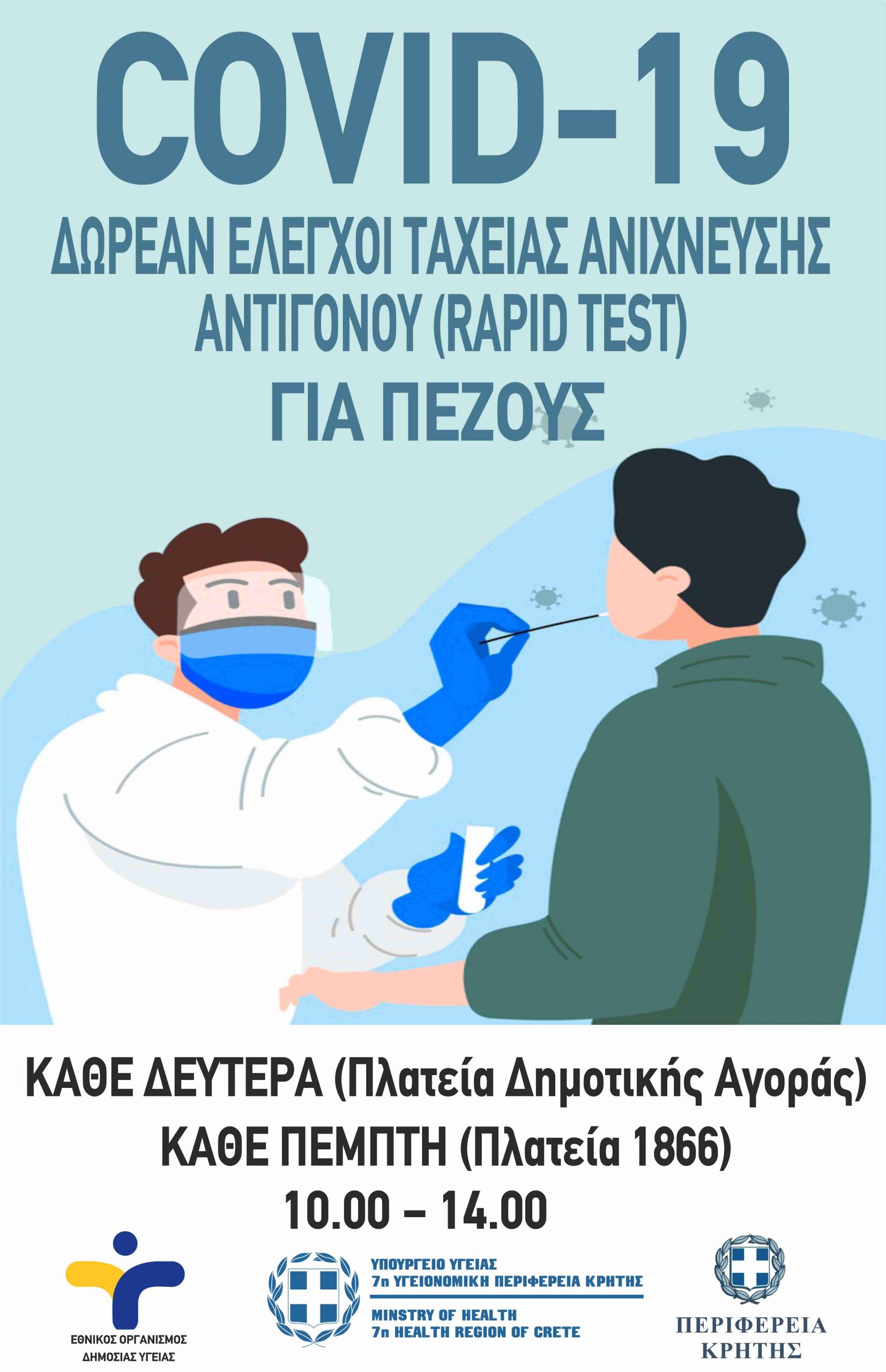 Δωρεάν rapid test για την ανίχνευση του COVID-19 σε πεζούς θα διεξάγει ο ΕΟΔΥ κάθε Δευτέρα στην Πλατεία Δημοτικής Αγοράς και κάθε Πέμπτη στην Πλατεία 1866, σε συνεργασία με την 7η ΥΠΕ, την Περιφέρεια Κρήτης / Περιφερειακή Ενότητα Χανίων και το Δήμο Χανίων.