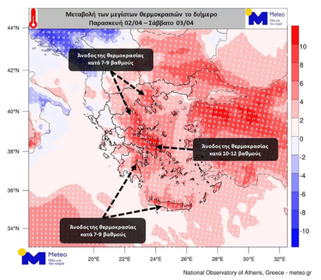 Όπως φαίνεται στον προγνωστικό χάρτη που ακολουθεί στην Κρήτη, οι μέγιστες θερμοκρασίες τις μεσημεριανές ώρες του Σαββάτου 03/04 θα είναι κατά μέσο όρο 7-9 βαθμούς υψηλότερες σε σχέση με τις μέγιστες θερμοκρασίες της Πέμπτης 01/04, ενώ στην Αττική, στη Βοιωτία και στην Εύβοια η άνοδος της θερμοκρασίας θα είναι της τάξης των 10-12 βαθμών Κελσίου