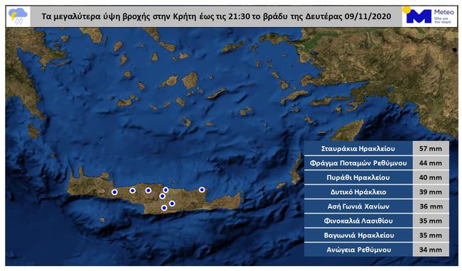 Σε συμφωνία με τα προγνωστικά στοιχεία του Εθνικού Αστεροσκοπείου Αθηνών/meteo.gr, τοπικά έντονες βροχοπτώσεις και σποραδικές καταιγίδες εκδηλώνονται στην Κρήτη από τις απογευματινές ώρες της Δευτέρας 09/11.