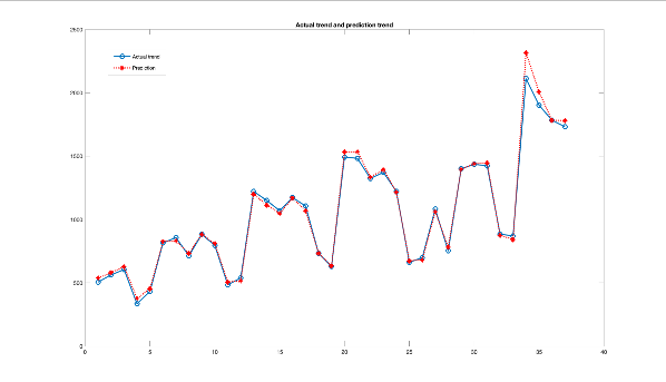 Η μπλε καμπύλη με κύκλους αναπαριστά την πραγματική τάση των κρουσμάτων. Η κόκκινη γραμμή με αστερίσκους αναπαριστά την πρόβλεψη με δεδομένα που δεν χρησιμοποιήθηκαν κατά την εκπαίδευση του μοντέλου (εκτός δείγματος), η οποία αφορά την πρόβλεψη ημερησίων κρουσμάτων 37 περιπτώσεων (ημερών).
